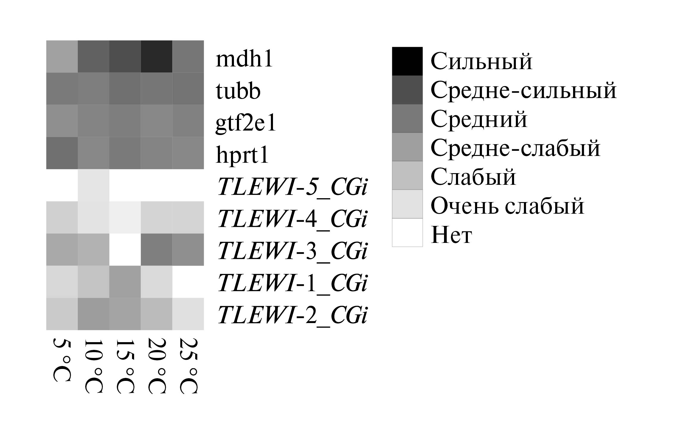 Ген транспозазы элемента TLEWI-2_CGi также продемонстрировал зависимость уровня транскрипции от температуры (см. табл. 3, рис. 3). Наблюдается повышение от средне-слабого (5°С) к среднему уровню (10 и 15°С) и последующее снижение к средне-слабому и слабому при 20 и 25°С соответственно. Кроме того, выявлена динамика экспрессии при изменении солености воды (см. табл. 3, рис. 4).