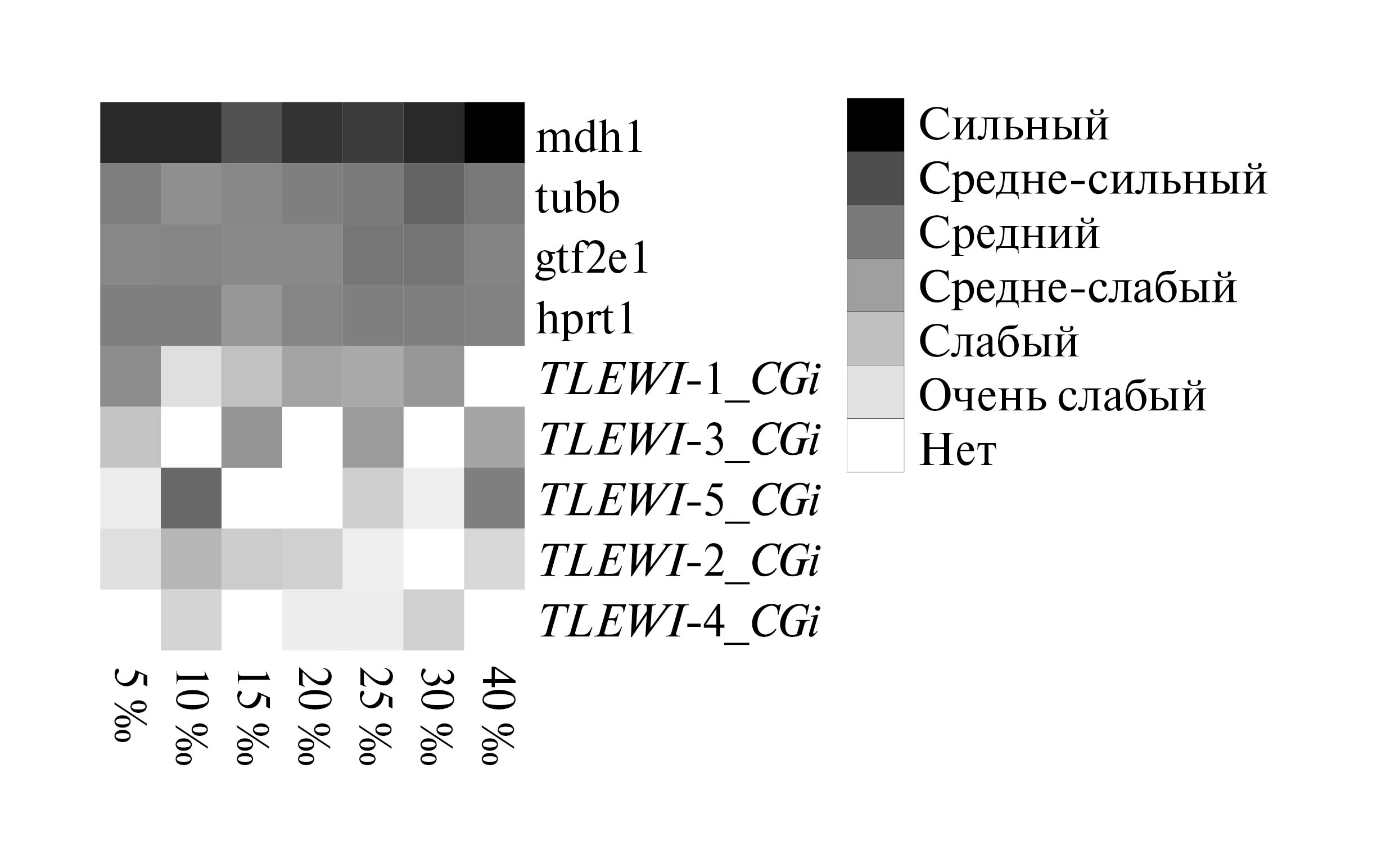 Примечание. * – отсутствовала экспрессия контрольных генов. М – мозаичная; ПБЗ – постоянная без зависимости; ЗУ – зависимая от условий, в скобках указаны диапазоны уровня транскрипционной активности. Уровни транскрипции: очень слабый (оч/сл), слабый (сл), средне-слабый (ср/сл), средний (ср), средне-сильный (ср/сил) и сильная (сил).