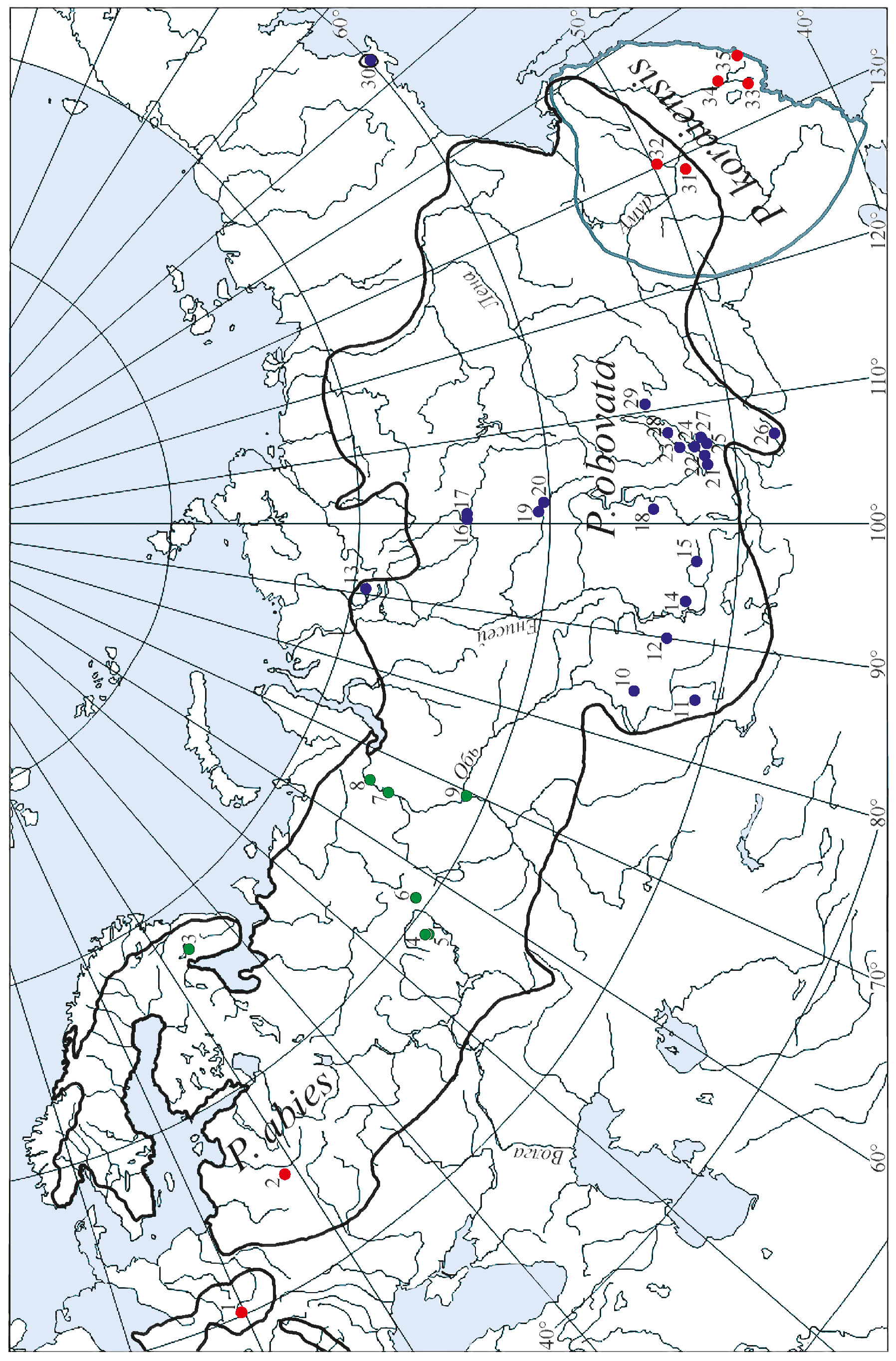В исследование были включены четыре группы популяций видового комплекса P. abies– P. obovata–P. koraiensis: популяции P. abies из Восточной Европы (Беларусь, Польша), популяции ели из европейской части России, Урала и Западно-Сибирской равнины, расположенные в зоне предполагаемой интрогрессивной гибридизации P. abies и P. obovata, популяции P. obovata из различных частей обширного ареала этого вида в Сибири и в Монголии, а также популяции P. koraiensis, естественно произрастающей в Приморском крае и Амурской области России, а также на северо-востоке Китая. Изучение генетической структуры, внутри- и межвидовой дифференциации популяций проводили на основе анализа изменчивости трех микросателлитных локусов хпДНК: Pt63718, Pt26081 и Pt71936, разработанных на основе хлоропластного генома Pinus thunbergii Parl. [59]. В качестве материала для исследований использовали образцы хвои и зародыши семян. Всего было проанализировано 35 популяций елей. Их местоположение, географические координаты и параметры изменчивости приведены на рис. 1 и в табл. 1.