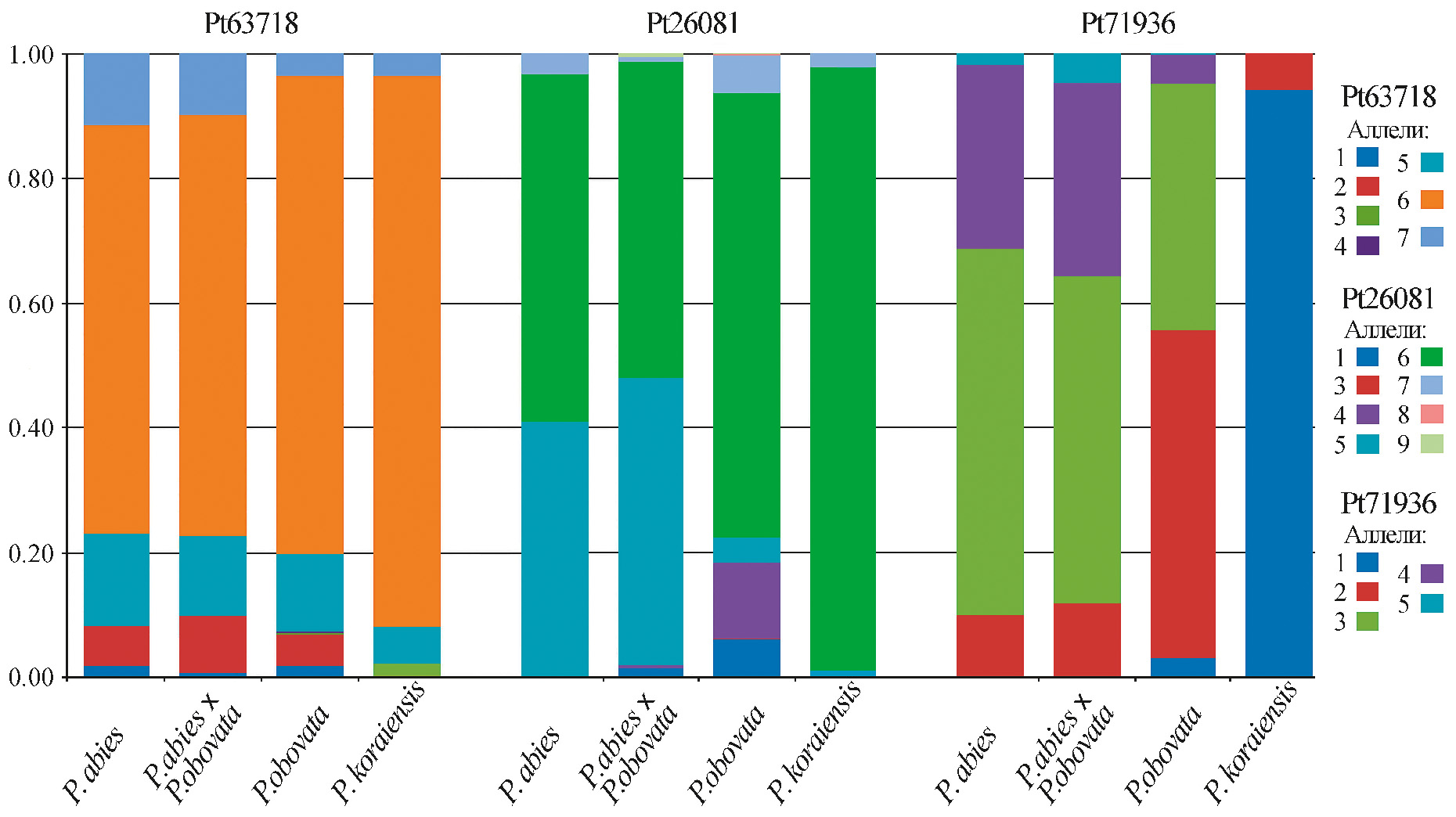 Из семи аллелей локуса Pt63718 лишь три (5, 6 и 7) являются общими. Наиболее высокую частоту встречаемости во всех изученных группах имеет аллель 6. Аллели 1, 3 и 4 относятся к категории редких. В локусе Pt26081 из восьми выявленных аллелей общим и наиболее распространенным является аллель 6. Аллели 1, 4 обнаружены только в популяциях P. obovata, а также в нескольких популяциях из зоны контакта ареалов этого вида с P. abies. Три редких аллеля (3, 8 и 9) встретились у отдельных индивидуумов в 1-2 популяциях P. obovata и P. abies × P. obovata. В локусе Pt71936 общим для трех исследованных видов елей является лишь аллель 2. Аллель 3 достаточно широко представлен в популяциях P. obovata и P. abies, но отсутствует у P. koraiensis. В изученных популяциях этого вида преобладает аллель 1, частота которого варьирует от 0.900 до 1. У P. obovata аллель 1 также выявляется в некоторых популяциях, но с очень низкой частотой (менее 10%).