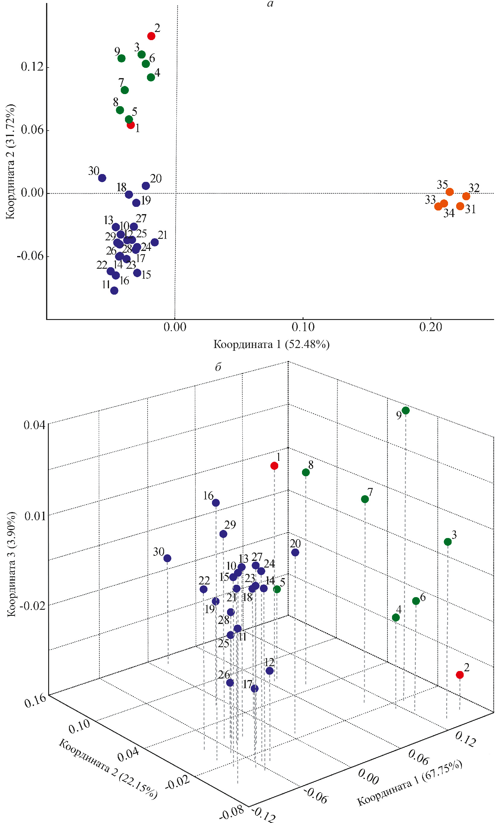 Рис. 3. Ординация изученных популяций елей на плоскости главных координат по данным матрицы парных значений ФPT, вычисленных по частотам аллелей трех cpSSR-локусов: а – ординация 35 популяций видового комплекса P. abies–P. obovata–P. koraiensis; б – ординация популяций P. obovata, P. abies и популяций из зоны контакта ареалов этих видов. Нумерация популяций соответствует табл. 1. Синим обозначены популяции P. obovata, красным – P. abies, зеленым – популяции из зоны контакта ареалов P. obovata и P. abies, оранжевым – P. koraiensis.