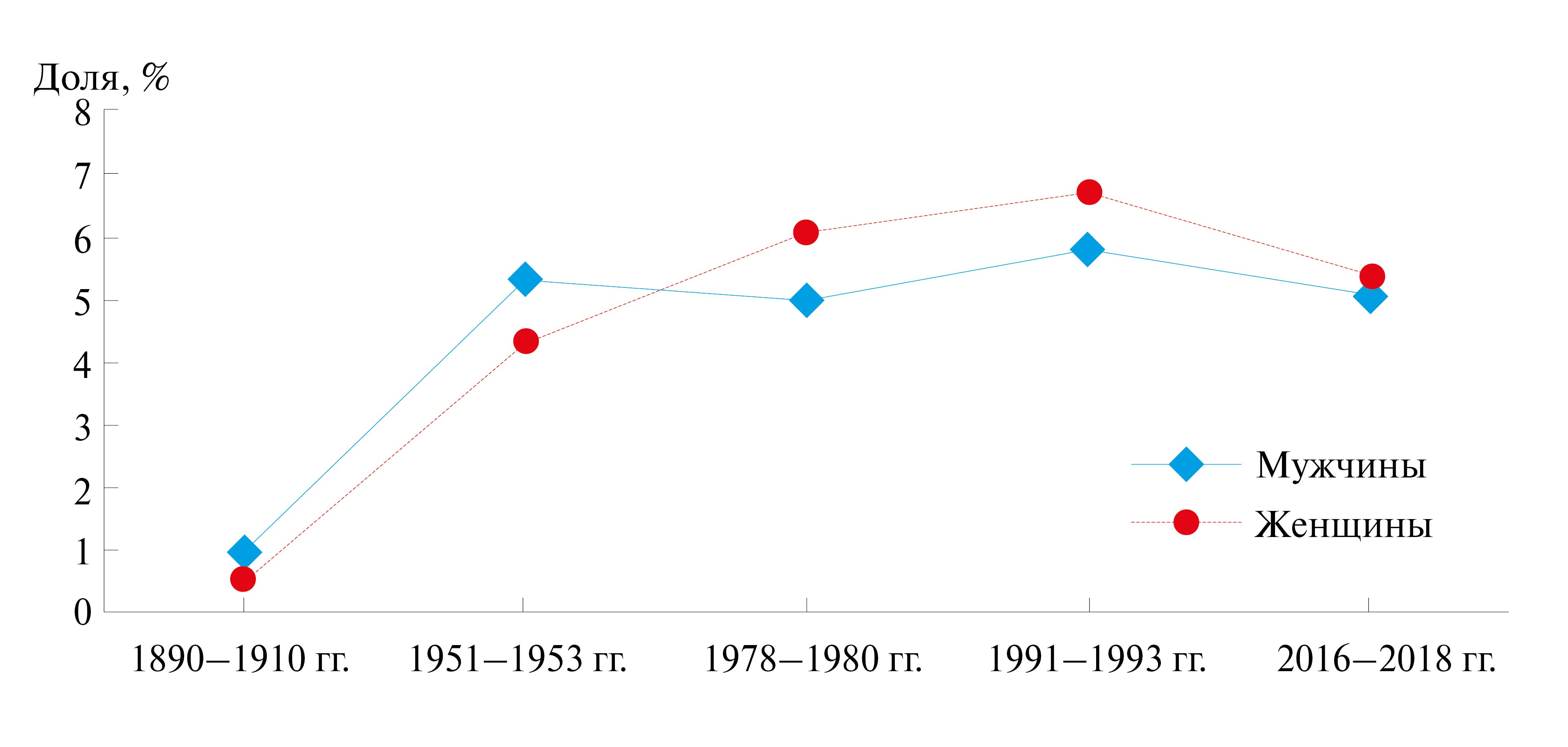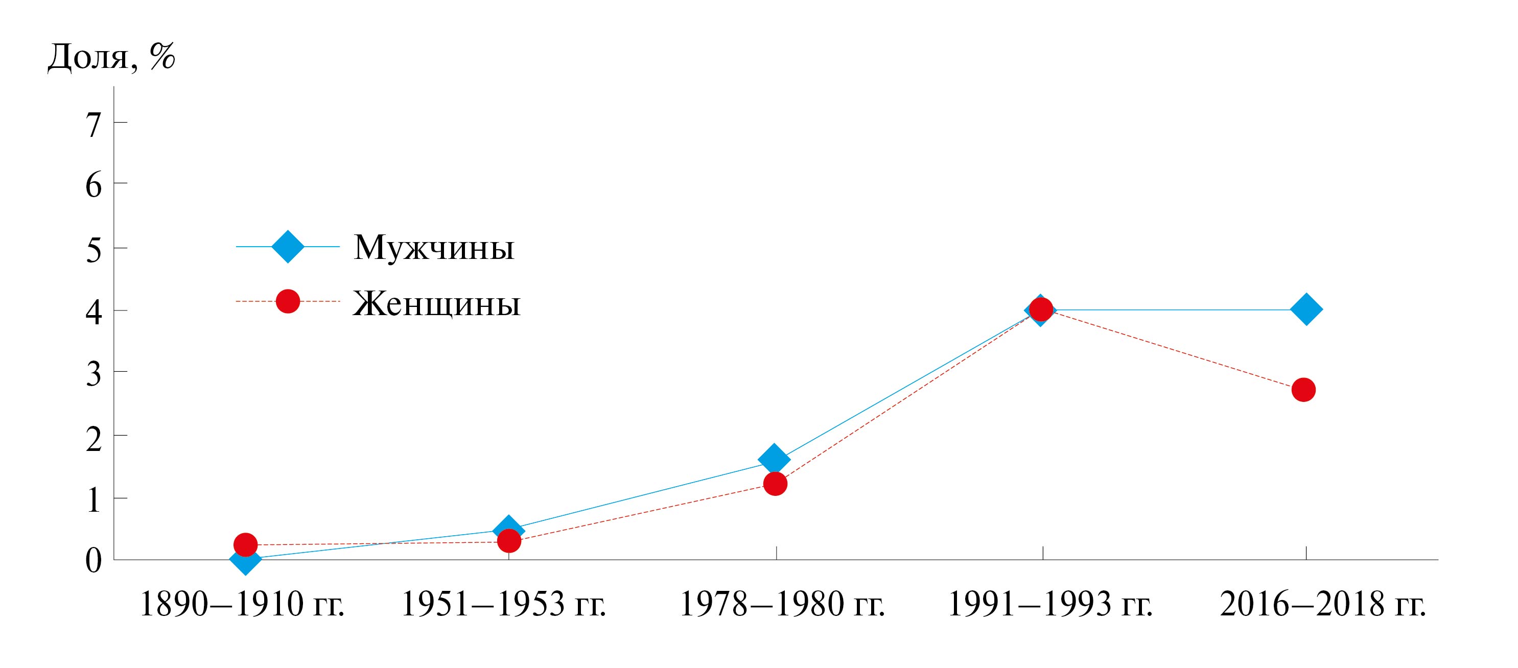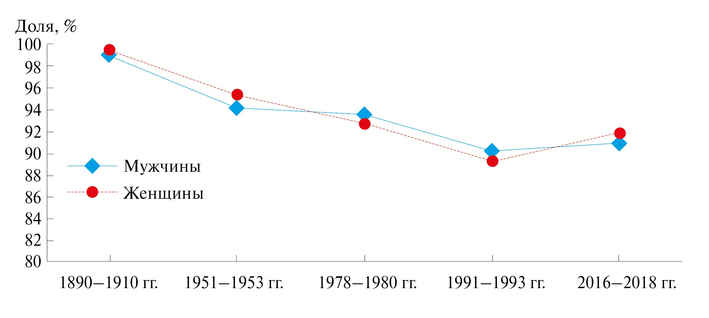 Административно-территориальные преобразования ХХ в., рост численности населения области, изменение эффективного размера популяции и активные миграционные процессы, о причинах и особенностях которых в разные временные периоды упоминалось в предыдущих работах [21–24], способствовали незначительному уменьшению доли русского населения (у мужчин с 99.02 до 90.93%, у женщин с 99.42 до 91.88%), увеличению доли украинцев (у мужчин с 0.99 до 5.05%, у женщин с 0.57 до 5.38%) и лиц других национальностей (у мужчин с 0 до 4.03, у женщин с 0.20 до 2.74%). При этом в регионе на протяжении всего 130-летнего периода значимых отличий в динамике мужчин и женщин русской национальности между городом и селом не установлено. Тогда как доля женщин украинской национальности с 1890–1910 гг. по 2016–2018 гг. увеличилась в среднем в 7.5 раза в городе и в 6 раз в селе, а доля мужчин украинской национальности значительно увеличилась в селе (в среднем в 4 раза), чем в городе (в среднем в 2 раза). За анализируемый период наблюдался рост доли других национальностей (кроме русской и украинской) среди женщин как в городе (в 5 раз), так и в селе (в 6 раз), а среди мужчин более интенсивный рост наблюдался в городе (в 5 раз), чем в селе (в 2 раза).