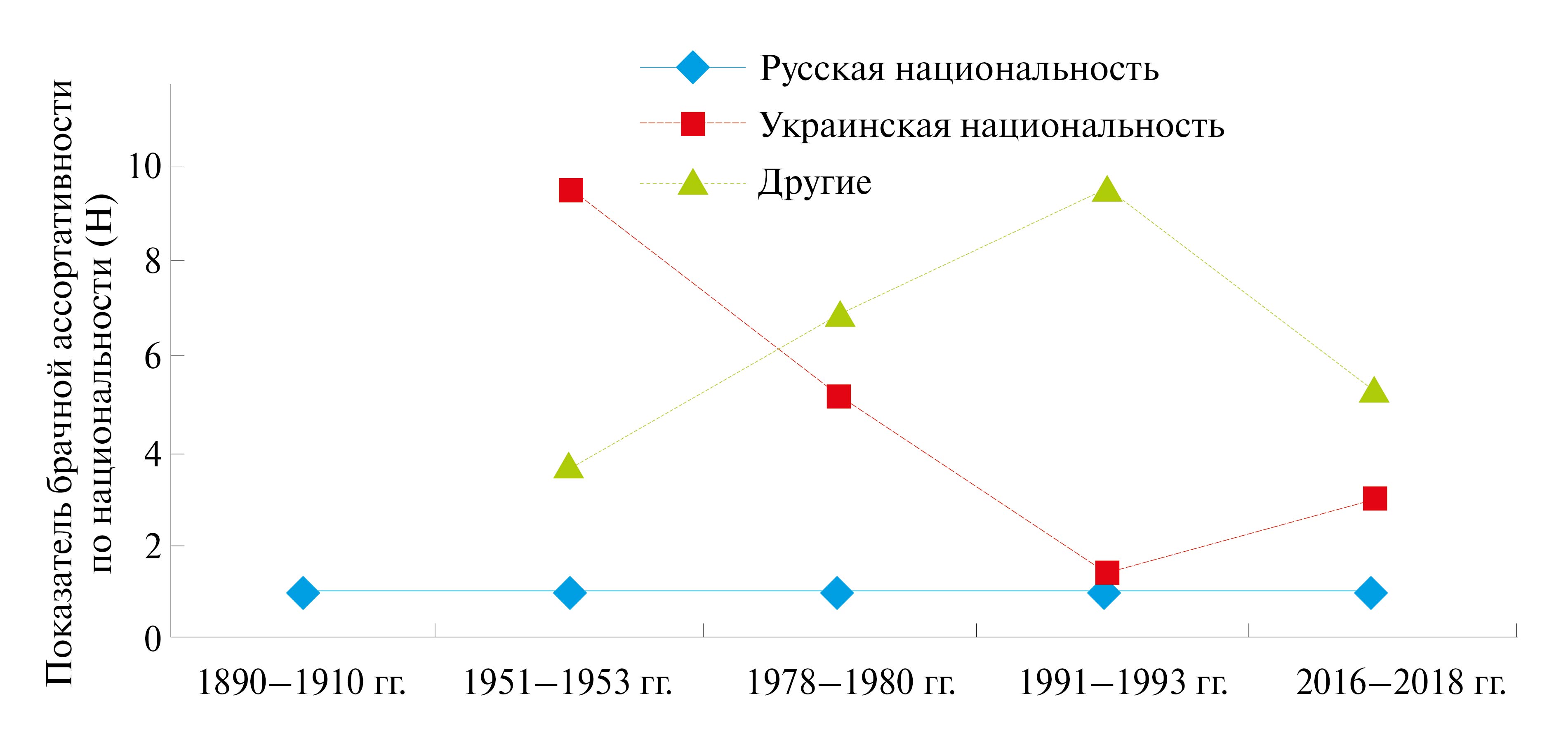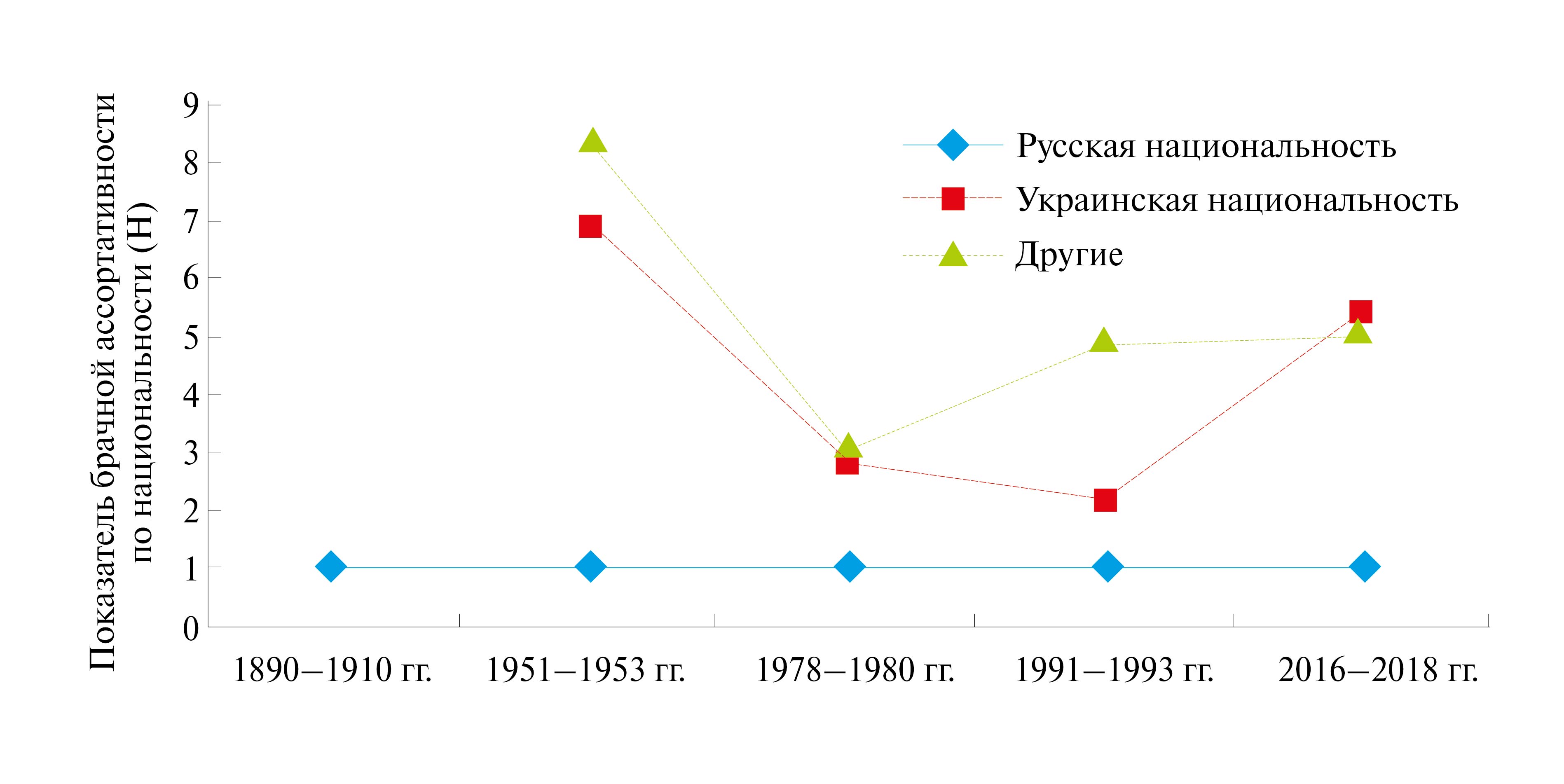 Следует отметить, что наблюдалась положительная брачная ассортативность по национальному признаку без отличий между городом и селом во все исследуемые периоды по русской национальности. Брачная избирательность по украинской национальности снизилась в целом за 130 лет (и в городе, и в селе), а по другим национальностям уменьшалась в целом в городах, но увеличилась в селах.