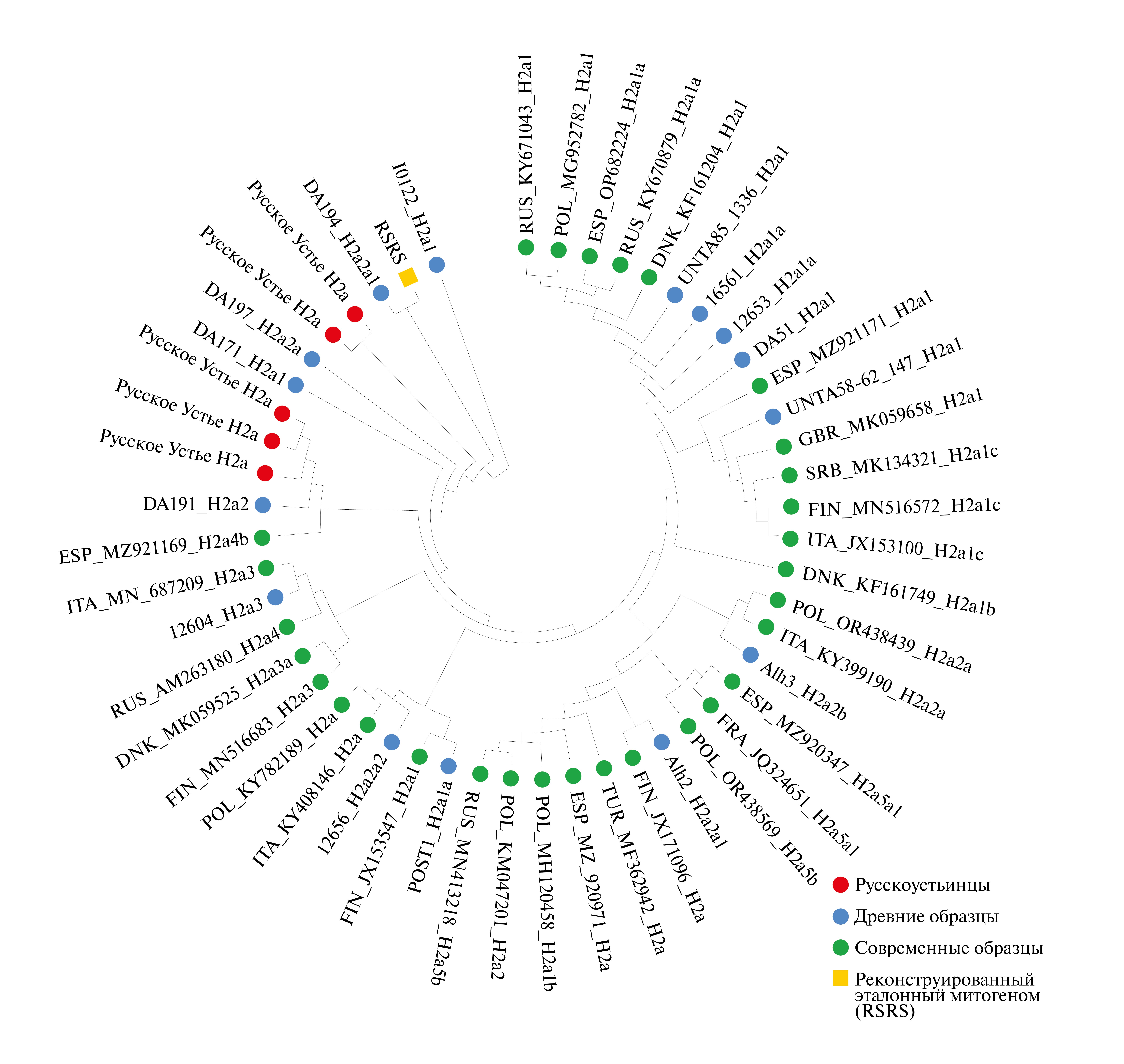 Филогенетическое дерево линии гаплогруппы H2a было построено с использованием метода невзвешенных парных групп со средним арифметическим (UPGMA) [17] в программе MEGA11 [18]. Эволюционные расстояния были рассчитаны с использованием метода максимального полного правдоподобия [19]. Филогенетический анализ был проведен на выборке, которая включала 51 образец мтДНК (16028-181), размером 723 пар нуклеотидов (п. н.). Все включенные в анализ последовательности принадлежали к гаплогруппе H2a. В выборку были включены: один реконструированный эталонный митогеном (RSRS) [20], пять образцов из с. Русское Устье, 30 современных образцов из базы данных GenBank [21] и 15 древних образцов из базы данных AmtDB [22].