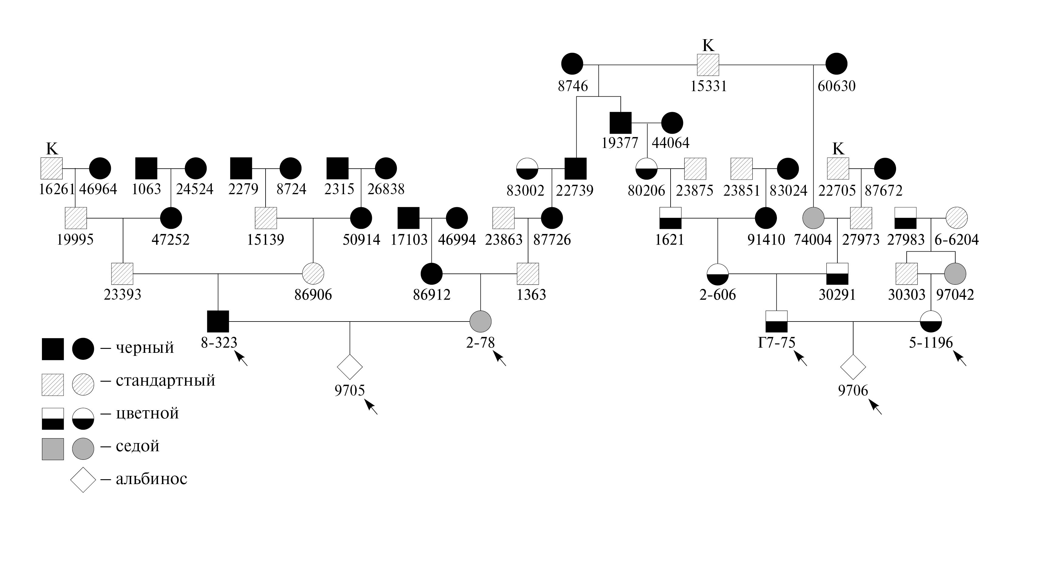 Рис. 2. Родословная соболей окраски альбинос, результат скрещивания двух линий, родоначальник – самец 15331 (заводской номер). Знаком «К» отмечены особи, завезенные с п-ва Камчатка. Стрелками обозначены индивиды, вошедшие в исследование.