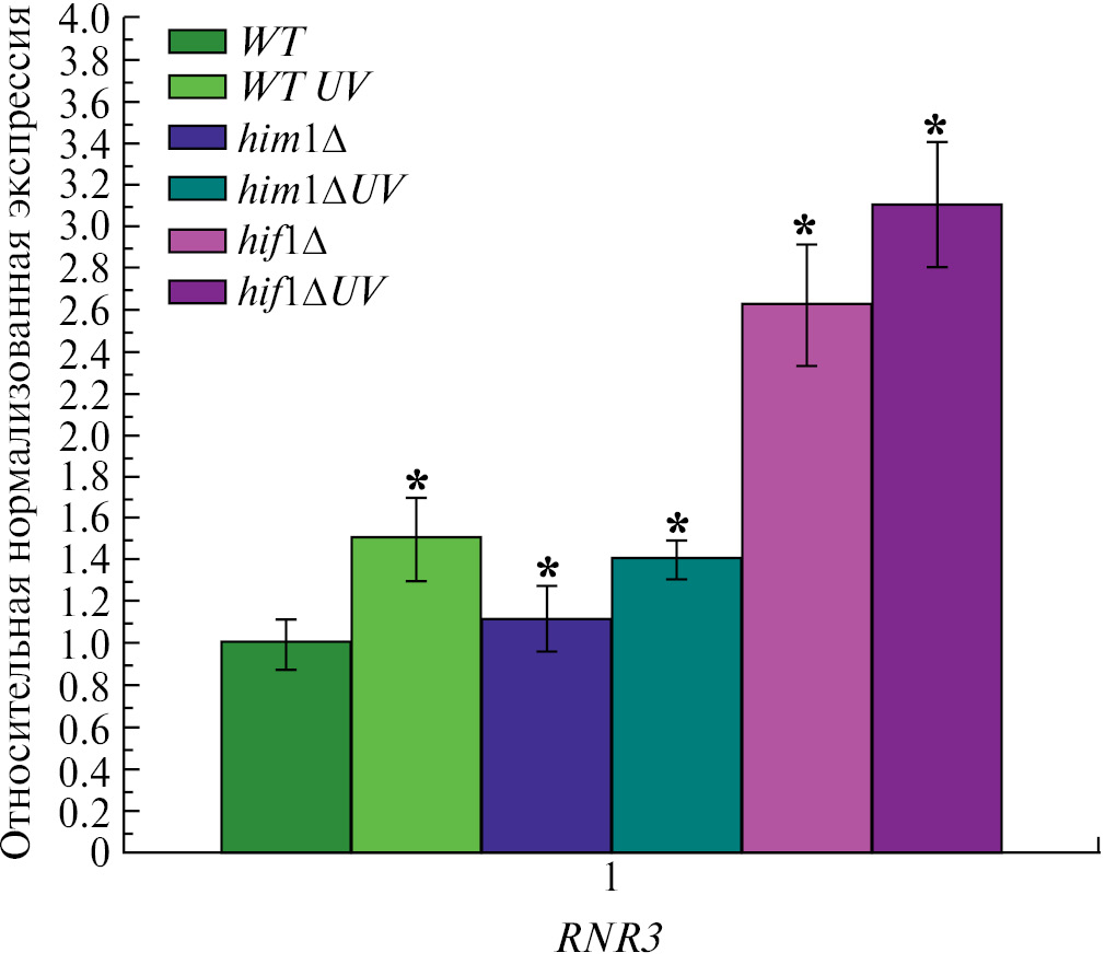 Рис. 3. Относительная нормализованная экспрессия гена RNR3 в штамме дикого типа и мутантных штаммах him1Δ и hif1Δ до и после облучения их ультрафиолетовым светом (после УФ-облучения клетки выдерживали в течение четырех часов при 30 °C в термостате для индукции), доза УФ-излучения составляла 14 Дж/м²; * р < 0,05, t-критерий Стьюдента.