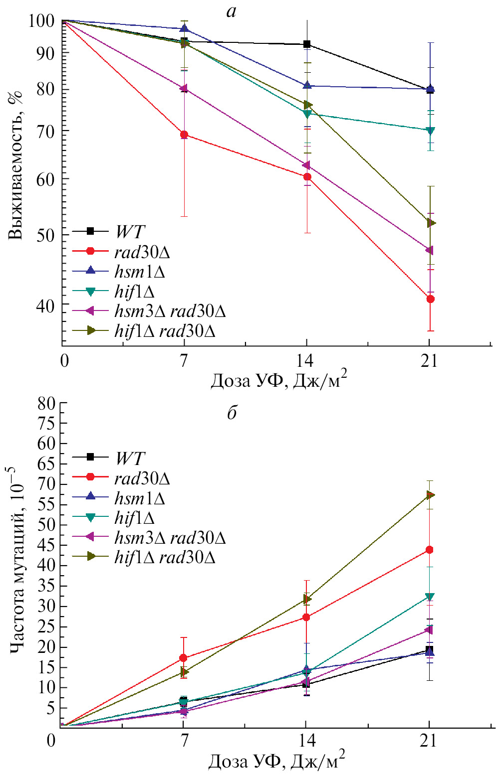 Рис. 4. Чувствительность к УФ-свету и частота УФ-индуцированного мутагенеза в локусе CAN1 у штамма дикого типа и мутантных штаммов rad30Δ, hsm3Δ, hif1Δ, hsm3Δ rad30Δ и hif1Δ rad30Δ при обработке дозами 7, 14 и 21 Дж/м² ультрафиолетового излучения. На графиках показаны стандартные ошибки среднего значения (± SEM), полученные в результате пяти независимых экспериментов.