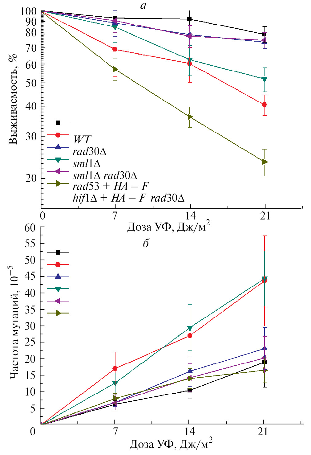 Рис. 5. Чувствительность к УФ-свету и частота УФ-индуцированного мутагенеза в локусе CAN1 у штамма дикого типа и мутантных штаммов rad30Δ, sml1Δ, rad53 + HA-F, sml1Δ rad30Δ и rad53 + HA-F rad30Δ при обработке дозами 7, 14 и 21 Дж/м² ультрафиолетового излучения. На графиках показаны стандартные ошибки среднего значения (± SEM), полученные в результате пяти независимых экспериментов.