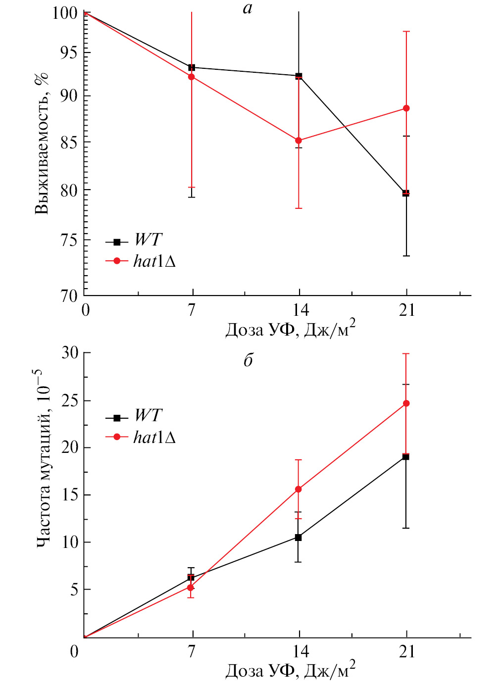 Рис. 6. Чувствительность к УФ-свету и частота УФ-индуцированного мутагенеза в локусе CAN1 у штамма дикого типа и мутантного штамма hat1Δ при обработке дозами 7, 14 и 21 Дж/м² ультрафиолетового излучения. На графиках показаны стандартные ошибки среднего значения (± SEM), полученные в результате пяти независимых экспериментов.