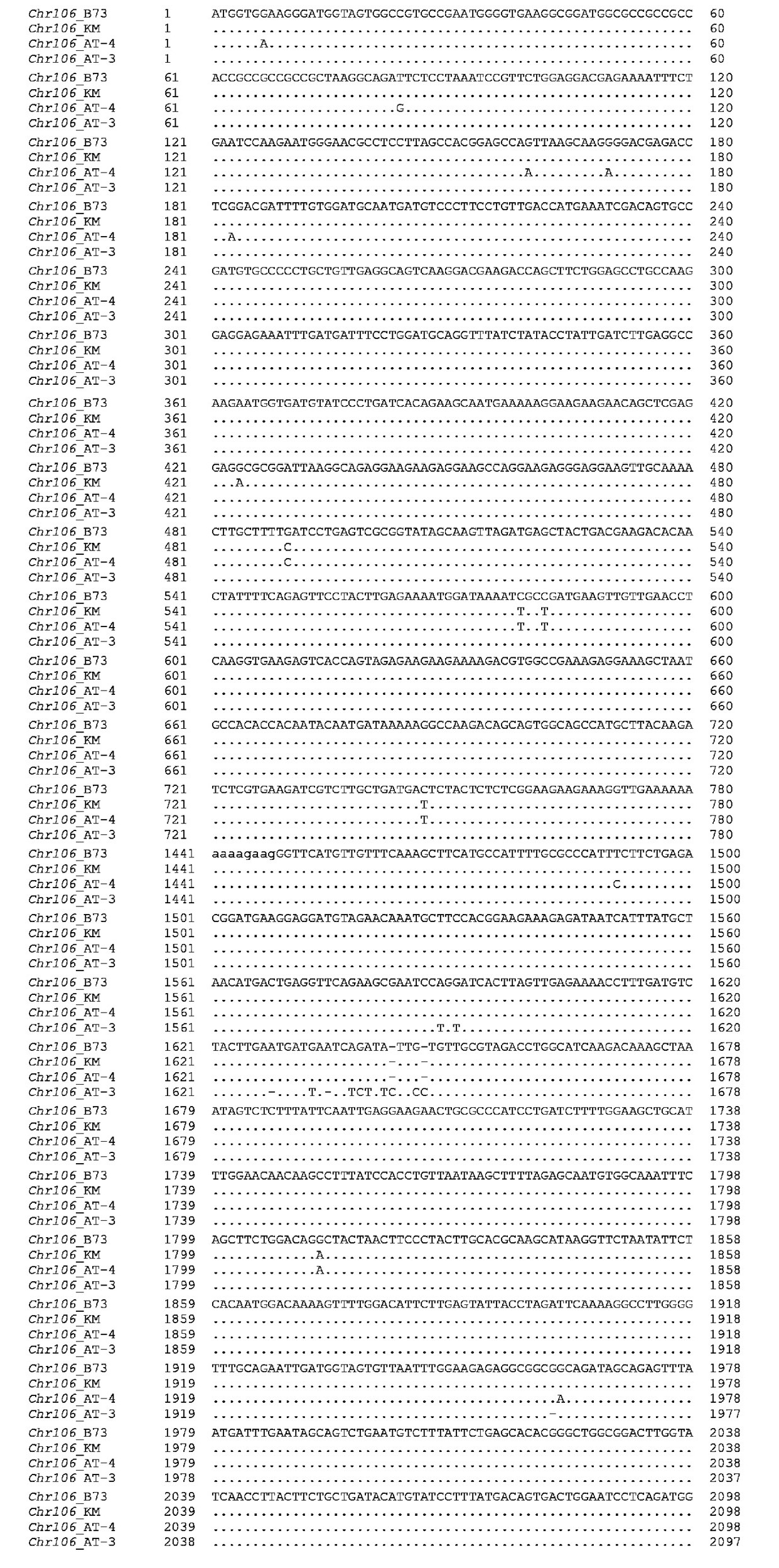 Ген кукурузы Zm_Chr106 кодирует белок, который участвует в ремоделировании хроматина. Транскрипты гена Chr106 кукурузы секвенированы и представлены нами в базе данных GenBank (MW441336.1 ‒ для линии КМ и OL649771.1 ‒ для линии АТ-4). Полученные нуклеотидные последовательности транскрипта гена Zm_Chr106 линий КМ, АТ-3 и АТ-4 сравнивали с нуклеотидной последовательностью мРНК Zm_Chr106 референсной линии В73. Количество ОНЗ на 1000 нуклеотидов у гена Zm_Chr106 у разных линий колеблется от 2.7 до 6.8. В белок-кодирующей части гена Zm_Chr106 у линии КМ обнаружены семь ОНЗ, у линии АТ-3 – десять ОНЗ и две делеции, у линии АТ-4 ‒ 15 ОНЗ (рис. 2). Как влияют обнаруженные ОНЗ на функцию белка CHR106 у линий АТ, пока неизвестно.