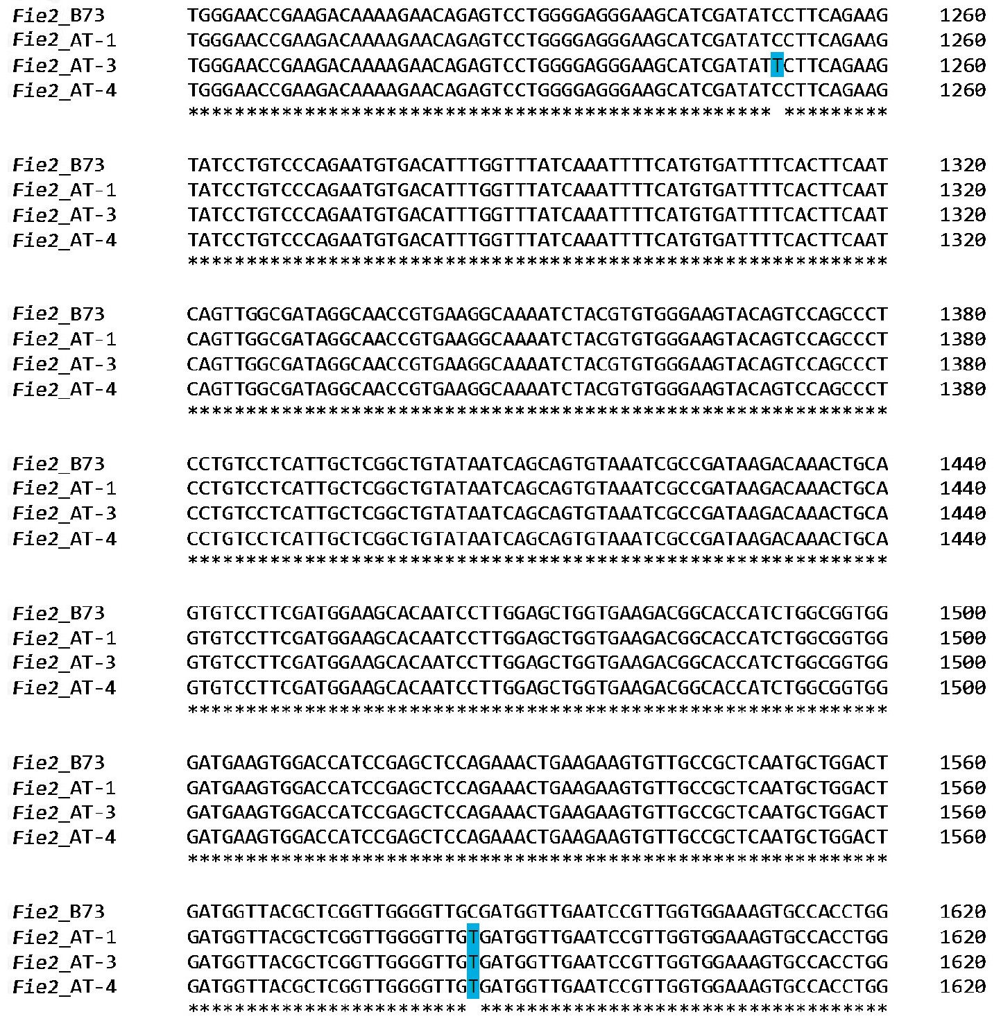 Рис. 4. Множественное выравнивание фрагмента нуклеотидных последовательностей гена Zm_Fie2 партеногенетических линий кукурузы АТ саратовской селекции и референсной линии B73. Выделенные буквы обозначают нуклеотидные замены.