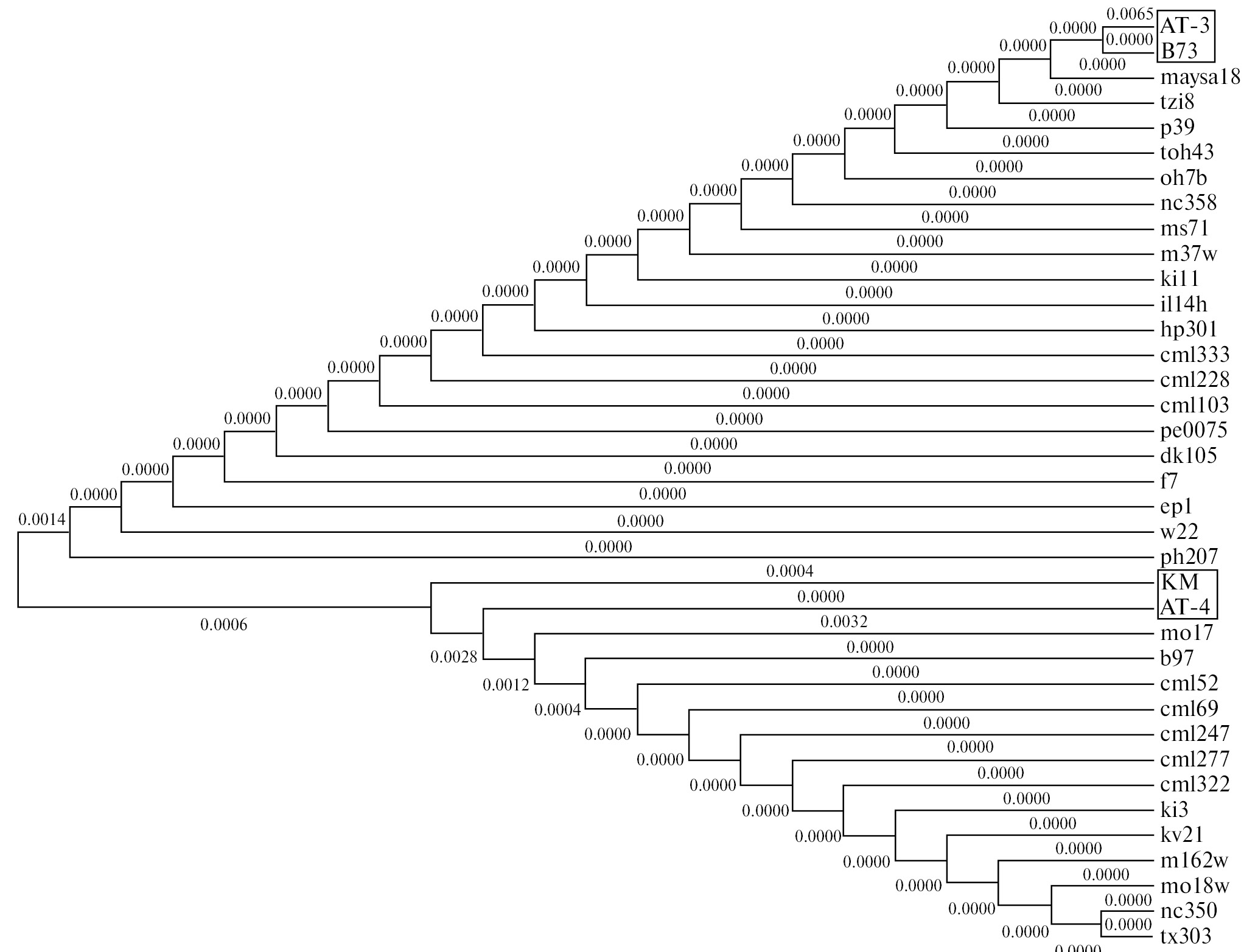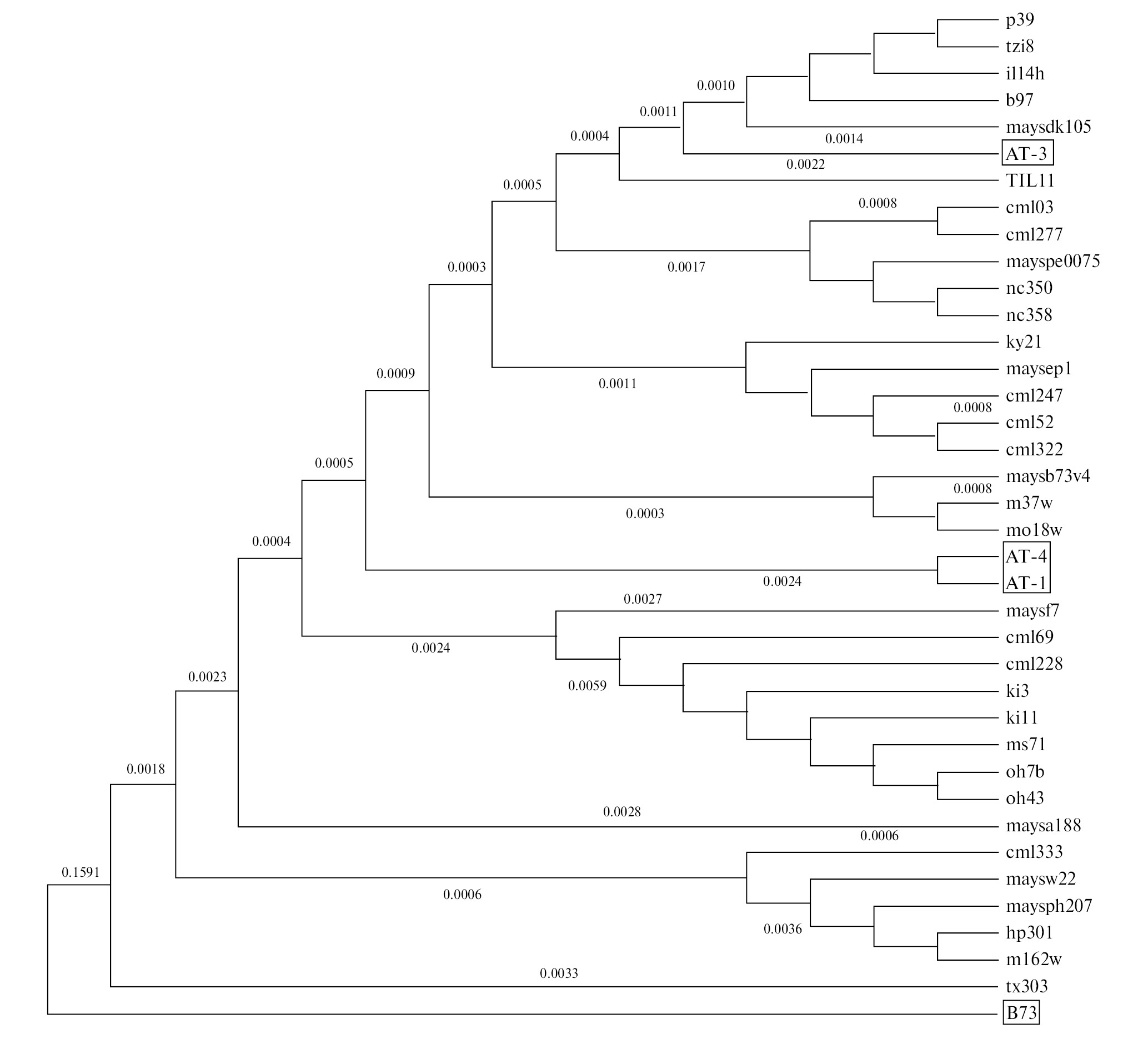 Рис. 5. Филограмма линий кукурузы, построенная по гену Zm_Chr106 с помощью программы MEGA 11. Квадратами отмечены исследованные в данной статье линии
