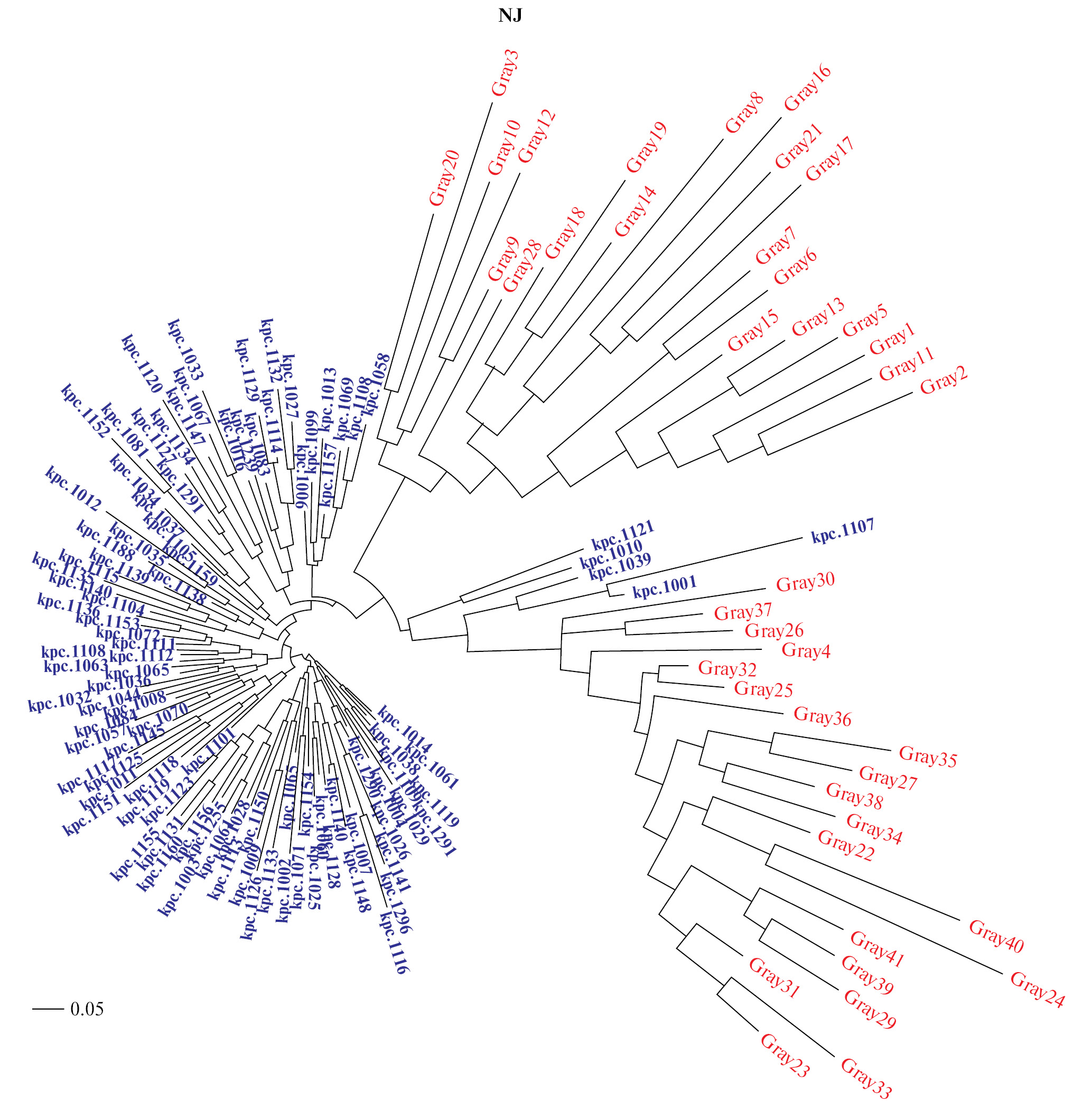 Рис. 3. NJ-дендрограмма взаимоотношений исследуемых субпопуляций серого украинского скота, построенная на основе попарных генетических дистанций DA Нея. Синим цветом обозначена асканийская субпопуляция, красным – алтайская.