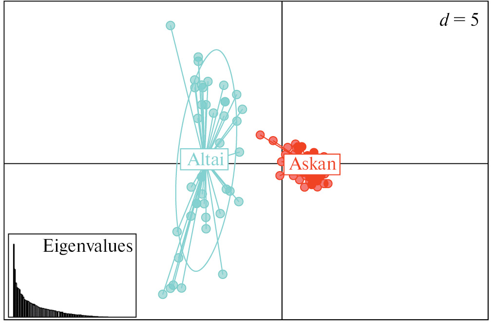 При последующем рассмотрении тех же самых субпопуляций с использованием метода главных компонент (PCA) (рис. 4) наблюдается их четкое разграничение с выраженной неоднородностью особей в алтайской и консолидацией животных в асканийской субпопуляции.