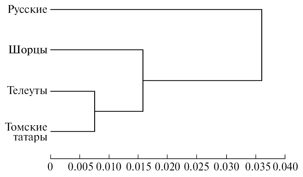 Ожидаемо наиболее дистанцированной в общем генетическом пространстве оказалась выборка русских – усредненное значение d, характеризующее удаленность русских от всех исследованных популяций, составило 0.028. Минимальные генетические расстояния получены между телеутами – томскими татарами (0.008), а также шорцами – телеутами (0.009). Полученные результаты отражают этногенез, географическую локализацию этнических популяций и межэтнические контакты сибирских народов. Так, по данным истории и этнографии, в сложении томских татар приняли участие выезжие телеуты, откочевавшие с князем Иркой Уделековым на новые территории. А интенсивные межэтнические связи шорцев и телеутов определены близостью расположения мест компактного расселения.
