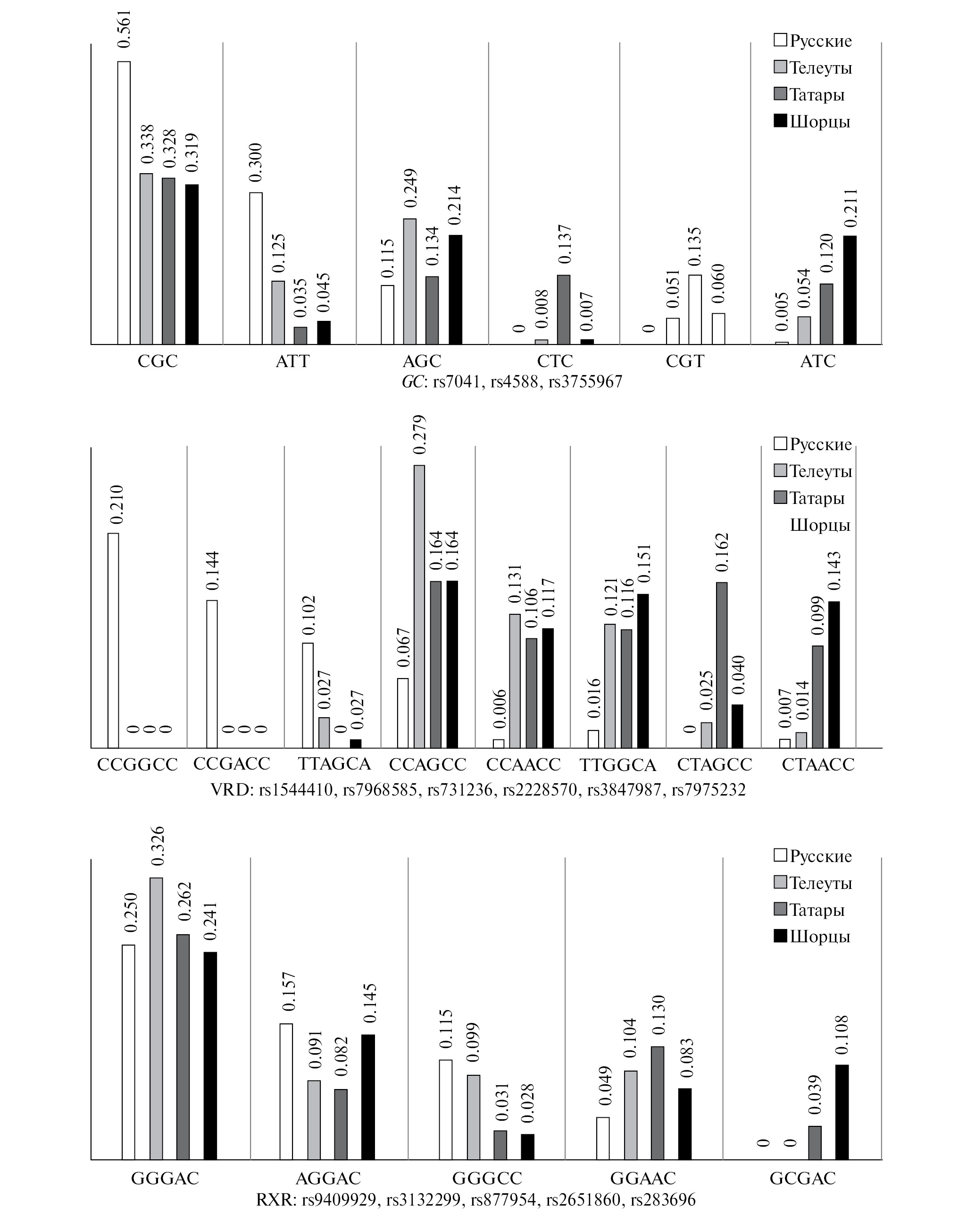 Для получения данных о потенциале популяций в контексте генетической адаптации к недостаточной обеспеченности витамином D был проведен анализ частот гаплотипов полиморфных вариантов генов. Частоты наиболее распространенных вариантов “Топ-3” показаны на столбчатых гистограммах (рис. 2).