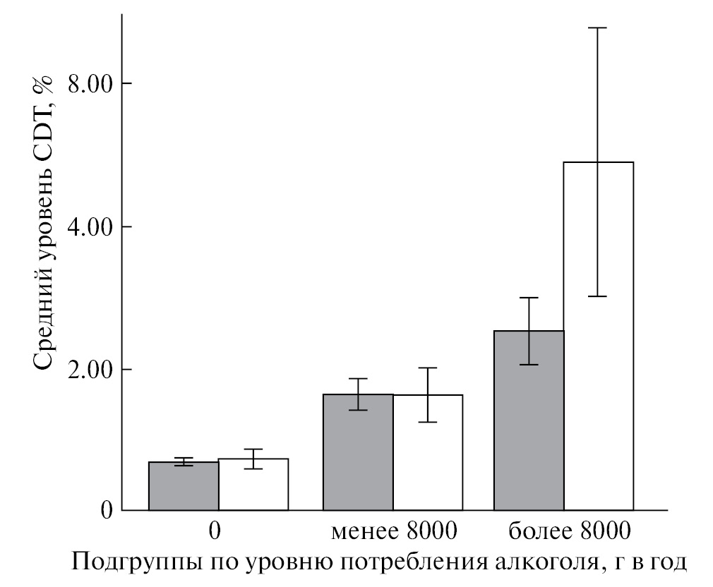 Рис. 2. Уровень CDT в зависимости от генотипа по ADH1B в подгруппах с разным уровнем потребления алкоголя. Серые столбики – носители генотипа ADH1B*Arg/Arg, белые – ADH1B*Arg/His.