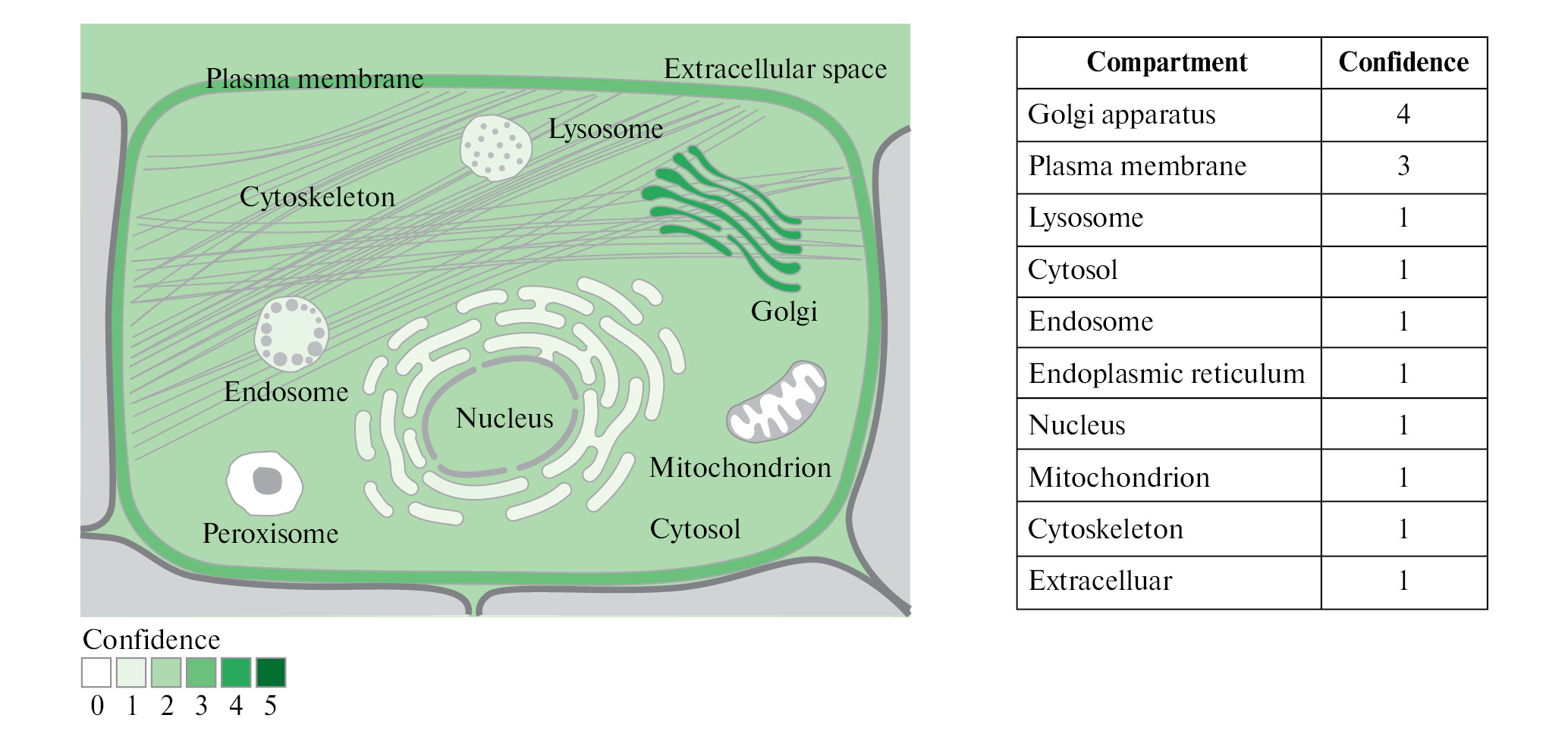Рис. 2. Внутриклеточная локализация NIPAL1 (GeneCards). Шкала достоверности имеет цветовую кодировку: от светло-зеленого (1) для низкой достоверности до темно-зеленого (5) для высокой достоверности; белый цвет (0) указывает на отсутствие признаков локализации.