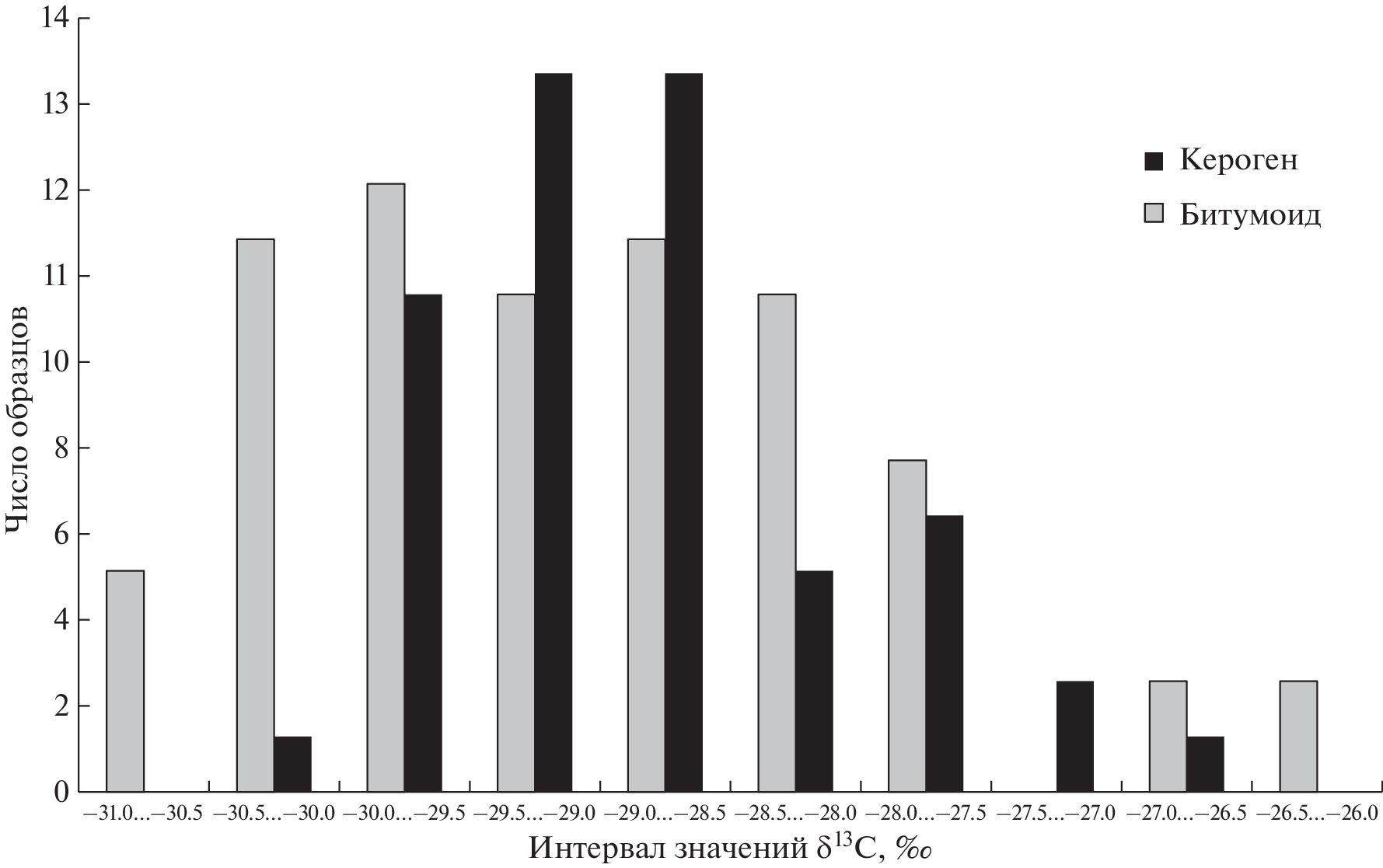 It has been established that the average values of some hydrocarbons biomarker coefficients of bitumens from the Domanik deposits and oils from the Domanik–Tournaisian complex coincide. These are the proportions of C27–C29 steranes, tri-/pentacyclanes ratio, and coefficients 2 × С17/С16 + С18 and 2 × С27/С26 + С28 calculated from n-alkane composition. Such indicators as the Pr/Ph, (Pr + Ph)/(n‑C17 + n‑C18), dia-/reg-steranes, and the sterane/hopane ratios in oils are slightly lower than in the bitumen. The average values of δ13C in asphaltene, resin, aromatic hydrocarbons, and aliphatic hydrocarbons fractions from oils of the Domanik genotype and in the studied bitumens are similar. The carbon isotope composition of asphaltenes in oils is depleted in 13С compared to those of resins and aromatic hydrocarbons, and vice versa in bitumens. A heterogeneous composition of the bacterial flora in the sediments of the Domanik Sea is suggested. In some places, species with high concentrations of diplopterol or hexafunctional bacteriohopanes likely dominated over bacteriohopantetrol.