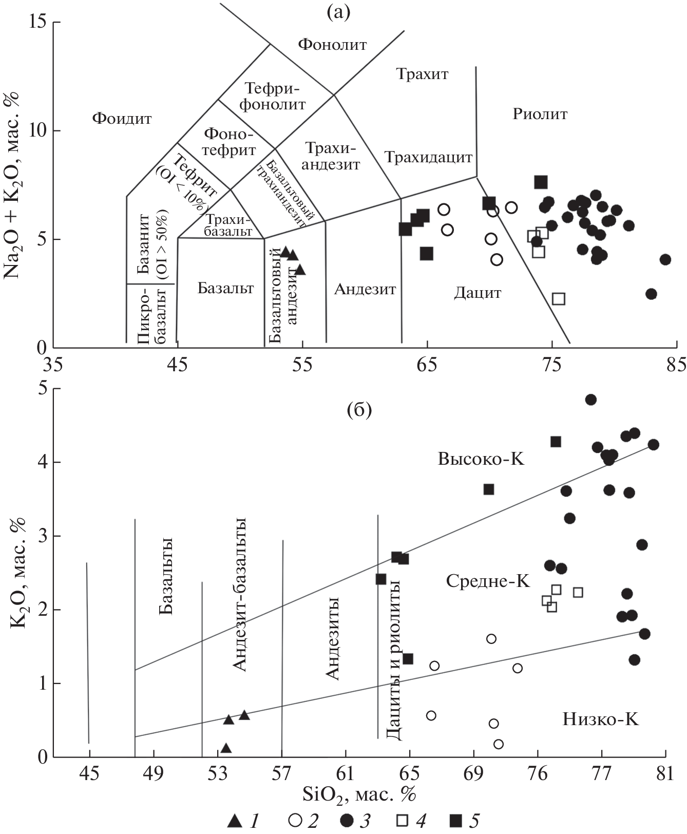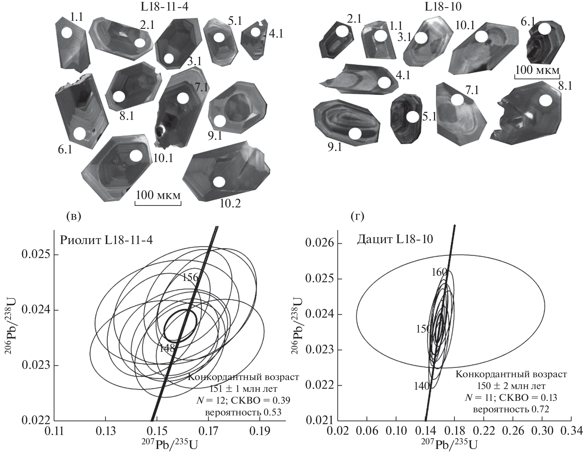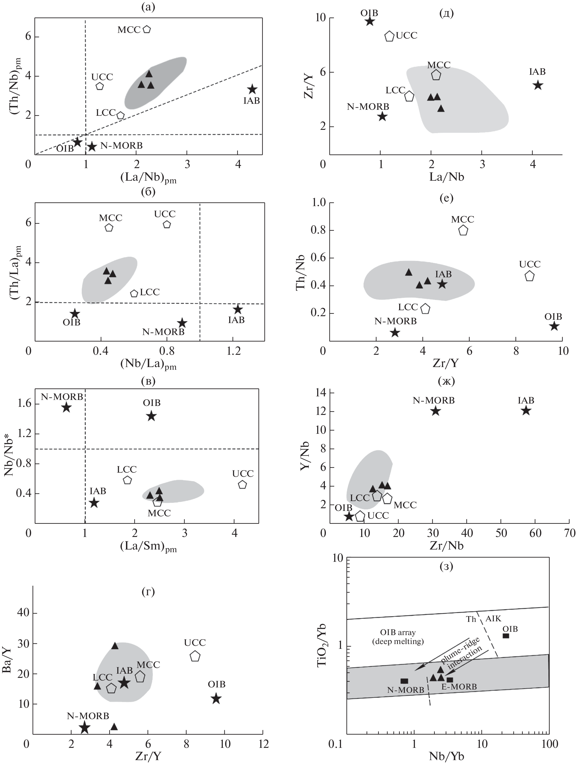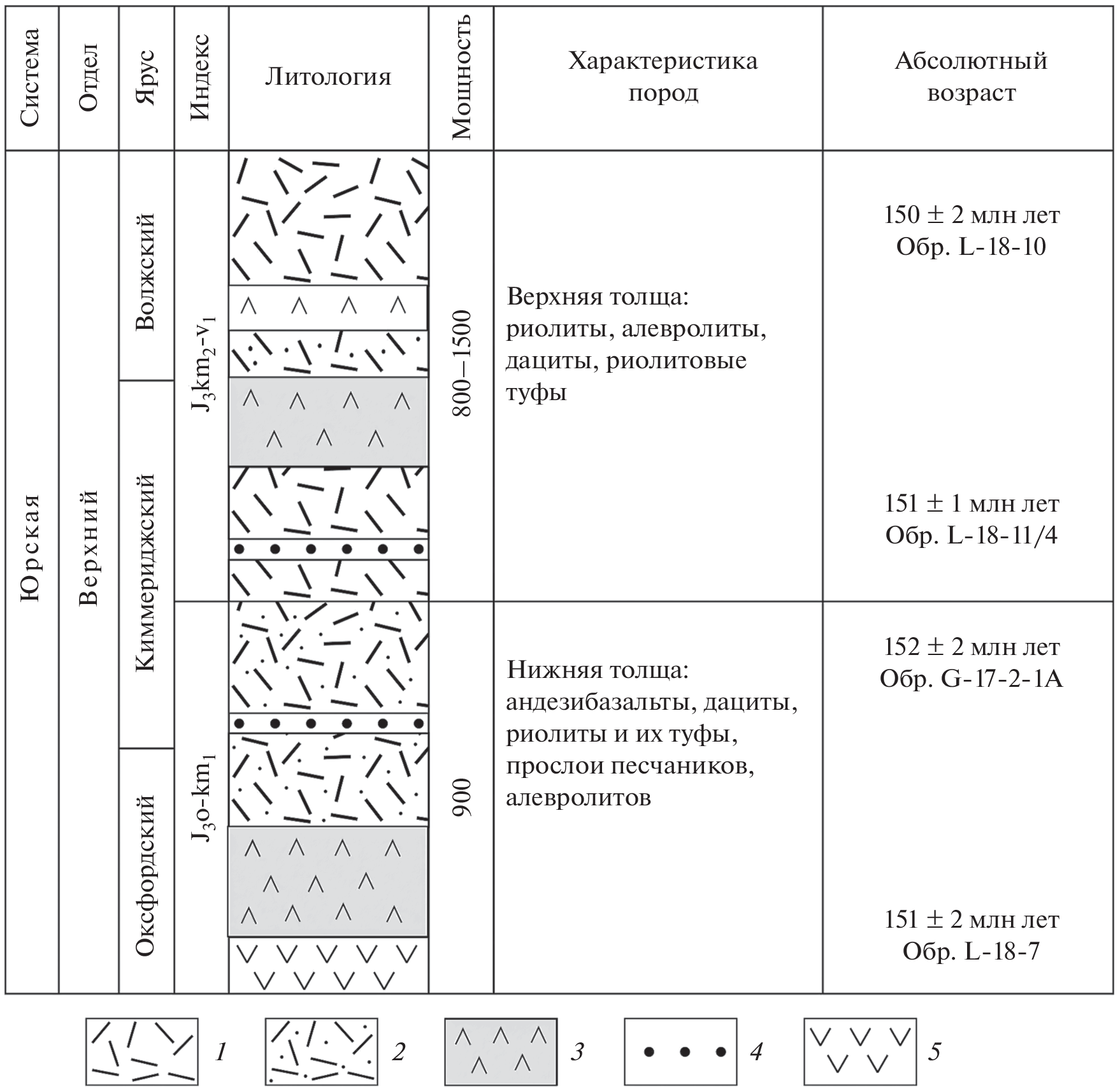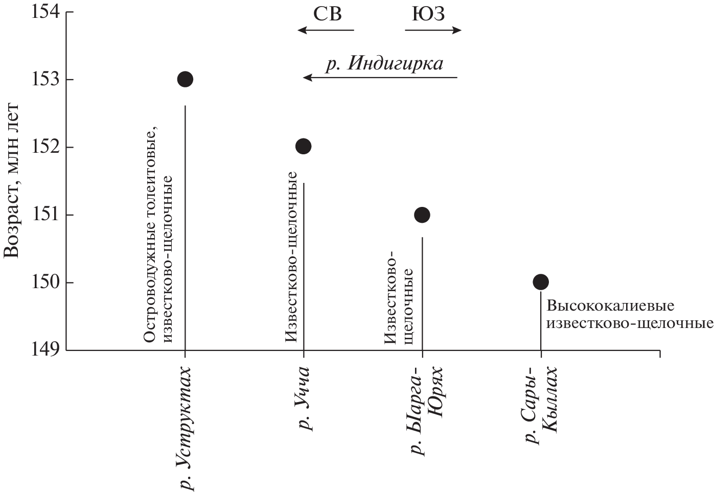 The Uyandina–Yasachnaya volcano-plutonic belt (UYVB) is one of the largest structures of this type in Northeast Asia. It strikes in the north-west direction for 900 km from the upper reaches of the Kolyma River to the upper reaches of the Selenyakh River. The belt is characterized by the strong facies variability and zoning, which is expressed in a change from mafic volcanic rocks (Ilin’-Tass zone) in the northeast to felsic volcanic rocks (Darpir zone) in the southwest. Poor knowledge of the UYVB results in an ambiguous interpretation of its geodynamic nature and volcanic evolution. The paper presents new detailed geochemical, isotopic, and geochronological data on the volcanic rocks of the Indigirka section of the Darpir zone of the UYVB. The U-Th-Pb SIMS zircon dating showed that volcanic rocks of the section previously attributed to the Oxfordian–Tithonian stages have the younger age within 150 ± 2–152 ± 2 Ma, which corresponds to the Tithonian. Andesites from the section base show Ta–Nb depletion, indicator element ratios Th/Nbpm, La/Nbpm, and La/Smpm > 1, and extremely low εNd = (–8), which may indicate a crustal contamination of mantle sources. Felsic volcanic rocks overlying the andesites have the postcollisional signatures. They are also characterized by the wide variations of εNd from –2.4 to –6.5 and model ages. The systematic position of the rocks in the section as well as upward increase of alkalinity and silica content from basaltic andesites to rhyolites in the upper parts of the section, which is typical of island-arc buildups, suggest that suprasubduction melts were generated beneath the collisional crust. Source of these melts could be a mantle domain that was enriched in fluid during previous subduction event.
