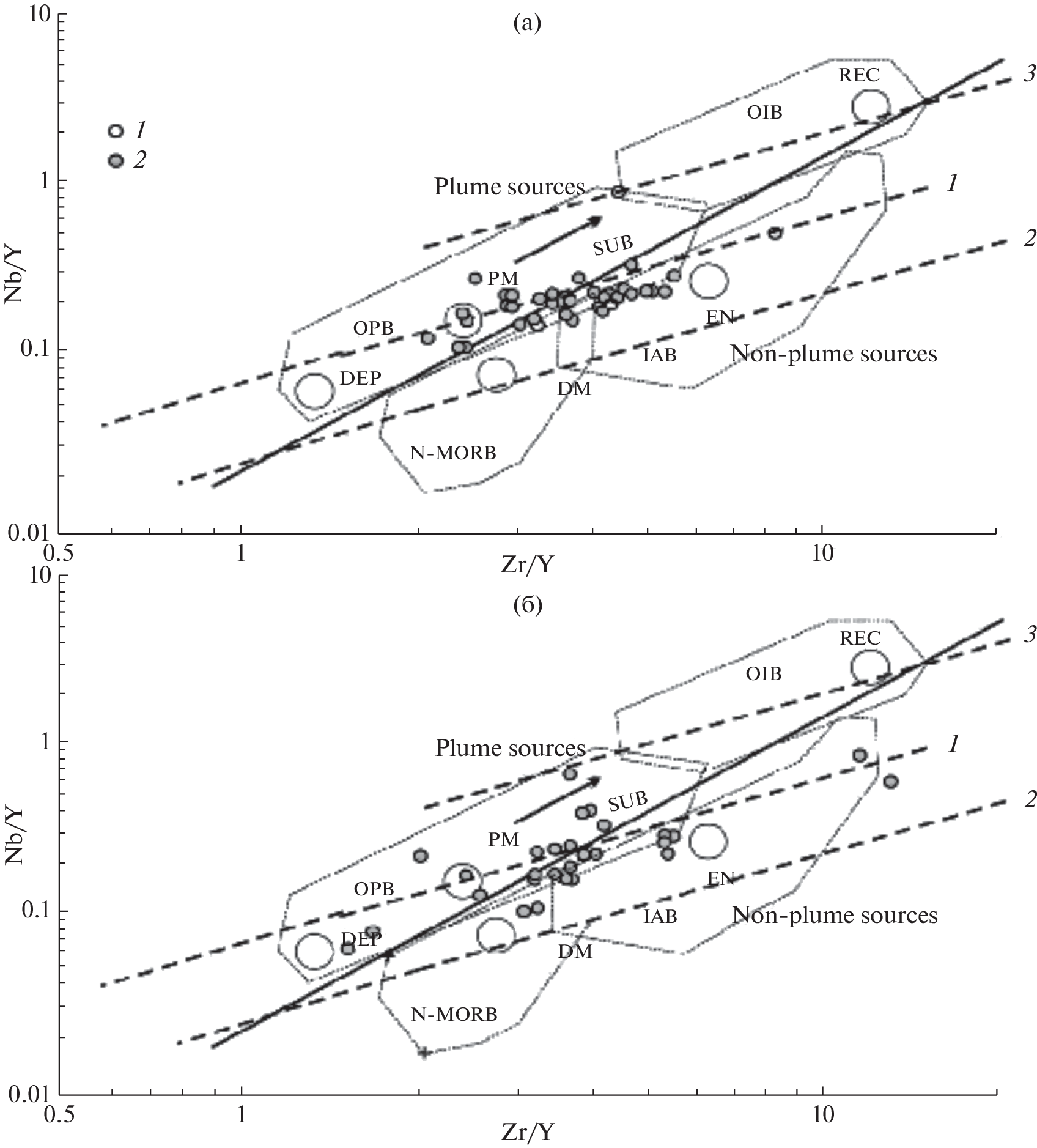 The paper demonstrates the possibility of application of the 143Nd/144Nd–Sm/Nd and Nb/Y–Zr/Y diagrams to systematics of basic–ultrabasic complexes of different age: Paleozoic Kalinovsky, Cambrian Sergeevsky and Vladimiro-Aleksandrovsky, and Jurassic and Paleocene ones. The position of data points of the Kalinovsky, Sergeevsky, and Vladimiro-Aleksandrovsky complexes in the diagrams indicates their derivation from a primitive mantle-type (BSE) source, the derivatives of which are frequently associated with Cu, Ni, Co, and PGE mineralization. The position of data points of metabasic rocks of the Avdokimovsky complex and peridotite rocks of the Dalny Kut massif in these diagrams suggests that they have originated from depleted mantle and are promising for the discovery of PGE-bearing chromite mineralization. Data points of Paleocene explosive structures of Sikhote-Alin in the Nb/Y–Zr/Y diagram fall on the trend of recycled crust as a source. This explains the alkaline (to subalkaline) type of magmatism and the high gas saturation of magmas. The explosive structures resemble lamproite pipes, while their rocks are geochemically and mineralogically close both to lamproites and kimberlites.