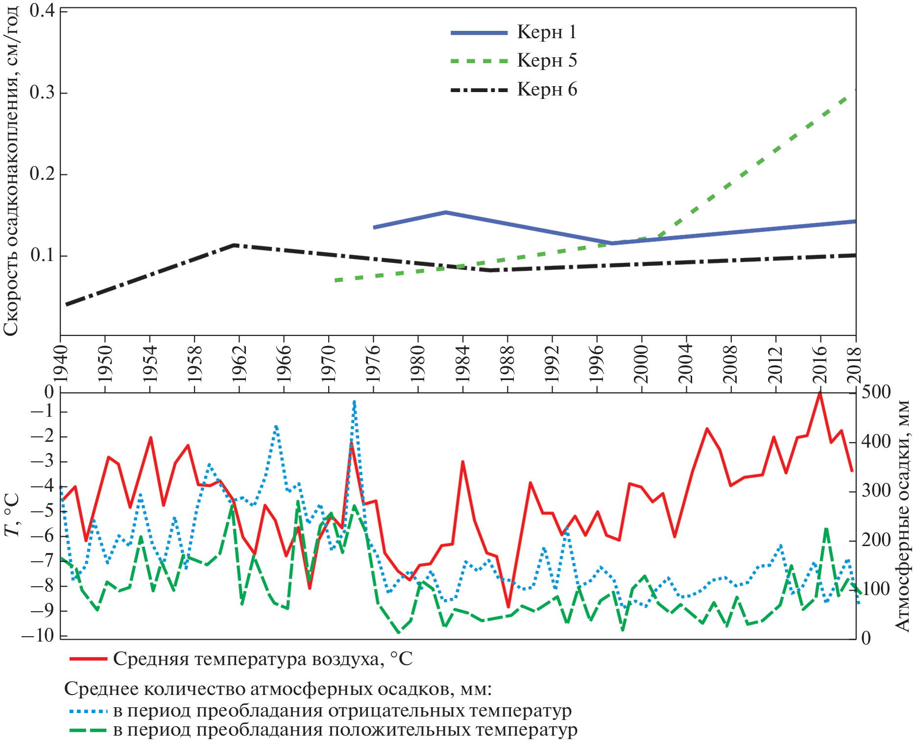 Periods of formation of different sedimentary lithotypes were determined using the results of the study of modern sedimentation processes in the Storefjorden Strait (West Spitsbergen). The chronology of sedimentation was established from variations in specific activity of 210Pb and 226Ra and verified by 137Cs data. Sedimentation rates have varied considerably over the last century in different parts of the sedimentation basin, ranging from 0.04 to 0.3 cm/yr. Sedimentation in the Storefjorden Strait was closely related to changing climatic conditions. Climatic factors (air temperature, atmospheric precipitation) have a different effect in morphologically different sections of the sedimentation basin. In the south of the strait, lithotypes are determined by an oceanological factor (bottom current). Despite the changes in sedimentation rate, the lithotype in the south of Storefjorden has remained stable for more than 100 years. In the north and in the central part of the strait, cooling in the period from 1970 to 1995 caused a change in the bottom sediment structure.