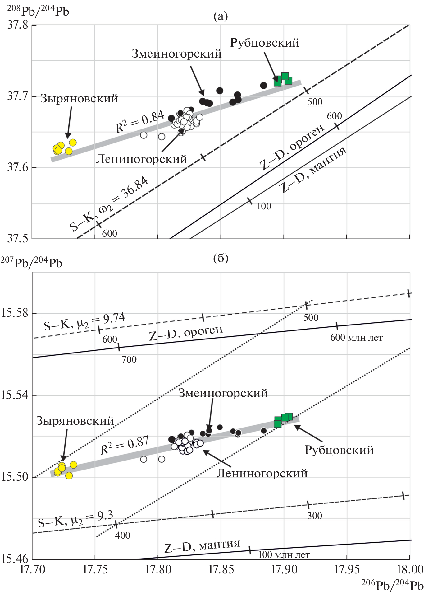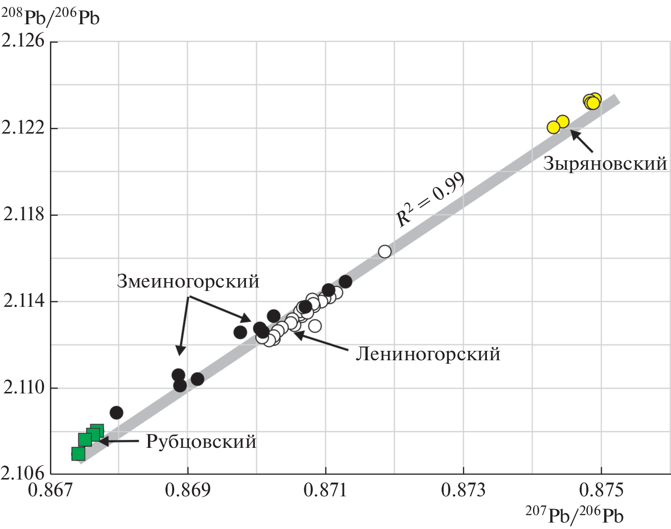 The Rudny Altai metallogenic province, which is concordant to the structures of the eponymous terrane and located in the Central Asian orogenic belt (CAOB), is one of the largest volcanic massive sulfide (VMS) provinces in the world. Lead isotopic composition of galena (61 samples in total) was measured for the first time with high accuracy (±0.02%, SD) for 20 sulfide base metal deposits representing the dominant Kuroko type in the Rudny Altai. They are enclosed in the Early–Middle Devonian volcano-sedimentary sequence in association with volcanic rocks of the bimodal basalt-rhyolite series. We studied the large and superlarge deposits of this type: Ridder-Sokol’noe, Tishinskoe, Novo-Leninogorskoe, Zyryanovskoe, Zmeinogorskoe, and Korbalikha. In the province, the isotope ratios 206Pb/204Pb, 207Pb/204Pb and 208Pb/204Pb vary within narrow limits. At average values of 206Pb/204Pb = 17.820, 207Pb/204Pb = 15.517 and 208Pb/204Pb = 37.669, the root mean square variations (variation coefficient, %) are 0.22, 0.038 and 0.063% respectively. Even more homogeneous composition is observed within ore districts of the province (0.054, 0.012 and 0.020%) and especially within deposits (0.025, 0.010 and 0.013%), where the scale of variations of lead isotope ratios reaches their measurement error (±0.02%). The lead isotopic composition in the province shows no isotopic “signatures” of juvenile (asthenospheric) origin. The evolutionary characteristics of the lead source (its depletion in uranium, the old model Pb-Pb age, and moderate values of the µ2 parameter) together with the persistent isotopic composition allow us to regard the lithospheric mantle consisting of metasomatized and recycled rocks as its source. This source was of regional significance, chemically (U-Th-Pb) and isotopically (Pb-Pb) homogeneous, and common for all deposits. Among other CAOB terranes, including the Chinese Altai, the 206Pb, 207Pb and 208Pb isotopes in the ore lead of the Rudny Altai terrane have the least radiogenic composition. The previously noted (Chiaradia et al., 2006) systematic decrease of radiogenic isotope content in the lead of ores and rocks of the CAOB terranes from the southwest to the northeast correlates with a decrease in the lower crustal contribution in the same direction in their composition, where fragments and blocks of Precambrian crust are also involved. The peculiarity of the Pb isotopic composition of the Rudny Altai terrane is largely determined by the absence of Precambrian crustal blocks in its composition.