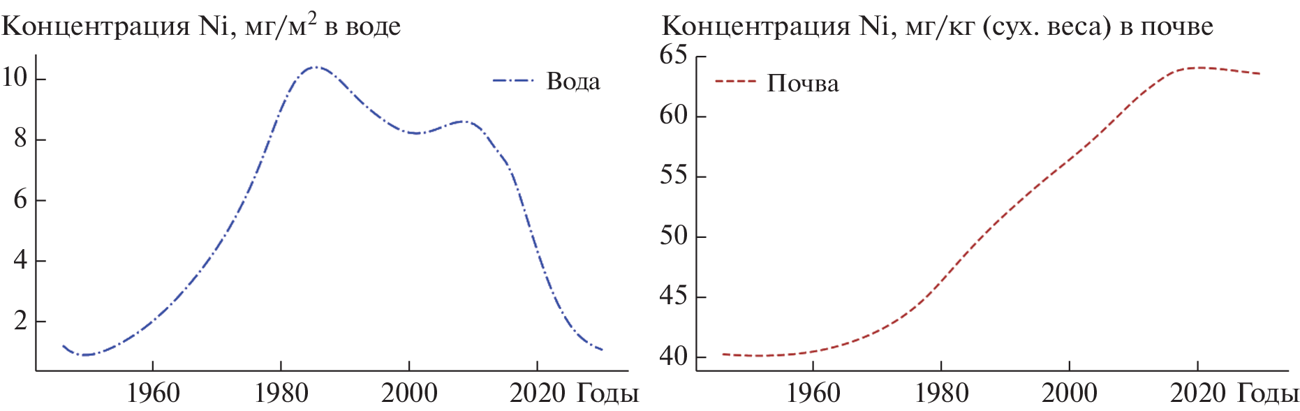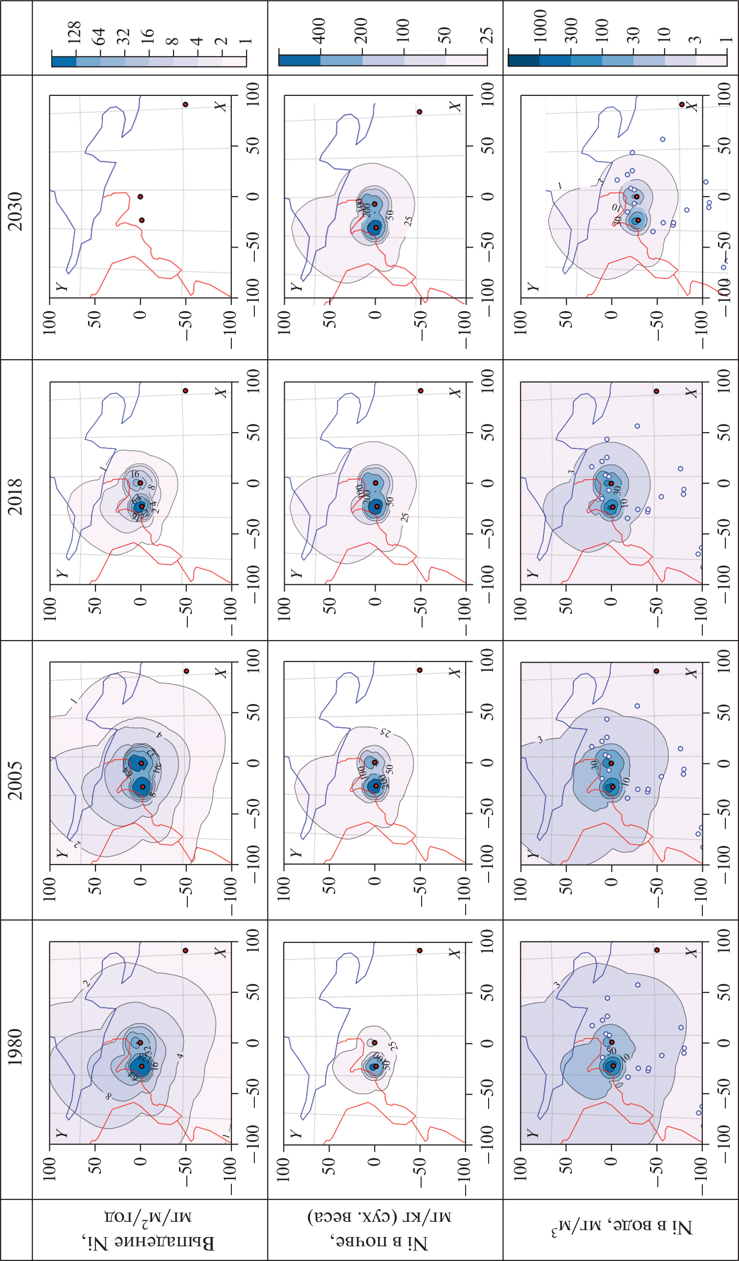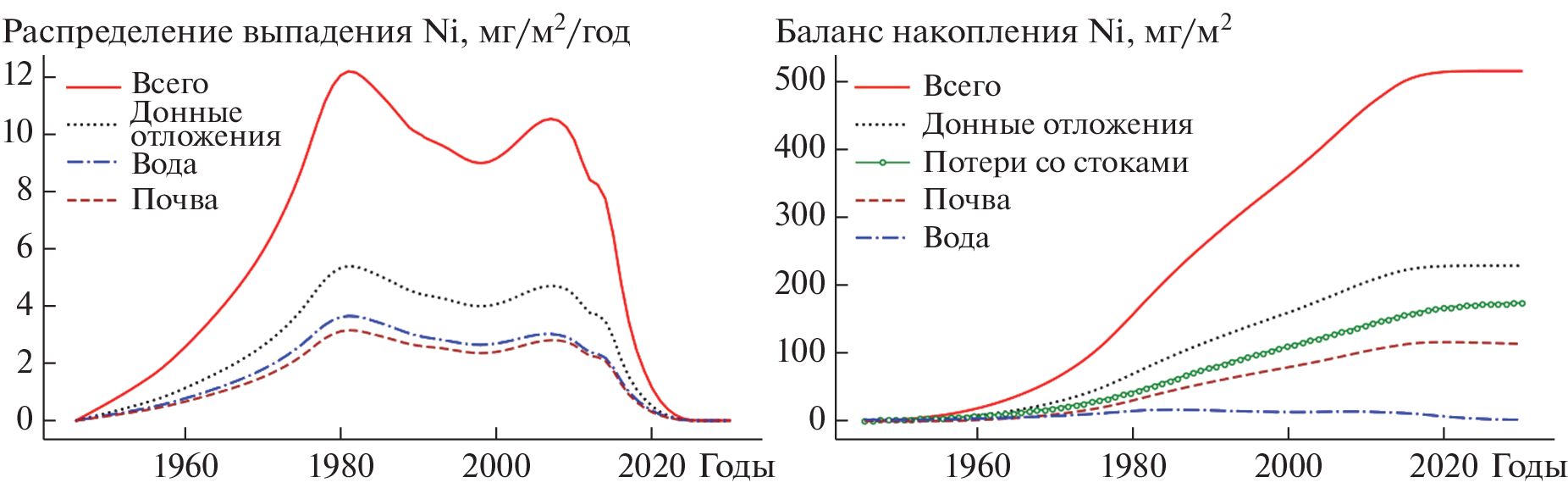 The paper discusses modeling the dynamics of nickel concentration in soils, water, and the bottom sediments of lakes caused by atmospheric emissions from the Pechenganickel plant, Kola Peninsula, throughout its whole operation period. The applied technology of balanced identification makes it possible to use a mathematical description of heterogeneous geochemical processes in ecosystems to combine heterogeneous experimental data and build up a computer model with an optimal balance of its complexity and fitting quality of the data. The model is used to analyze the spatial and temporal variability of natural objects in the zone of distribution of atmospheric pollution (nickel) from the Pechenganickel plant. The paper presents and discusses results of this study, including estimates of the retrospective state of the simulated objects (before the start of the intense studies) and a forecast of their dynamics until 2030. According to the model calculations, the intensity of Ni accumulation in the soil and bottom sediments was 2.35 and 4.48 mg/(m2 year) during the maximum deposition periods (1980–2005), whereas the model predicts a decrease in the intensity of Ni accumulation in the bottom sediments (0.23 mg/(m2 year)) and slow Ni leaching from the soil (0.19 mg/(m2 year)) after the shutdown of the plant.