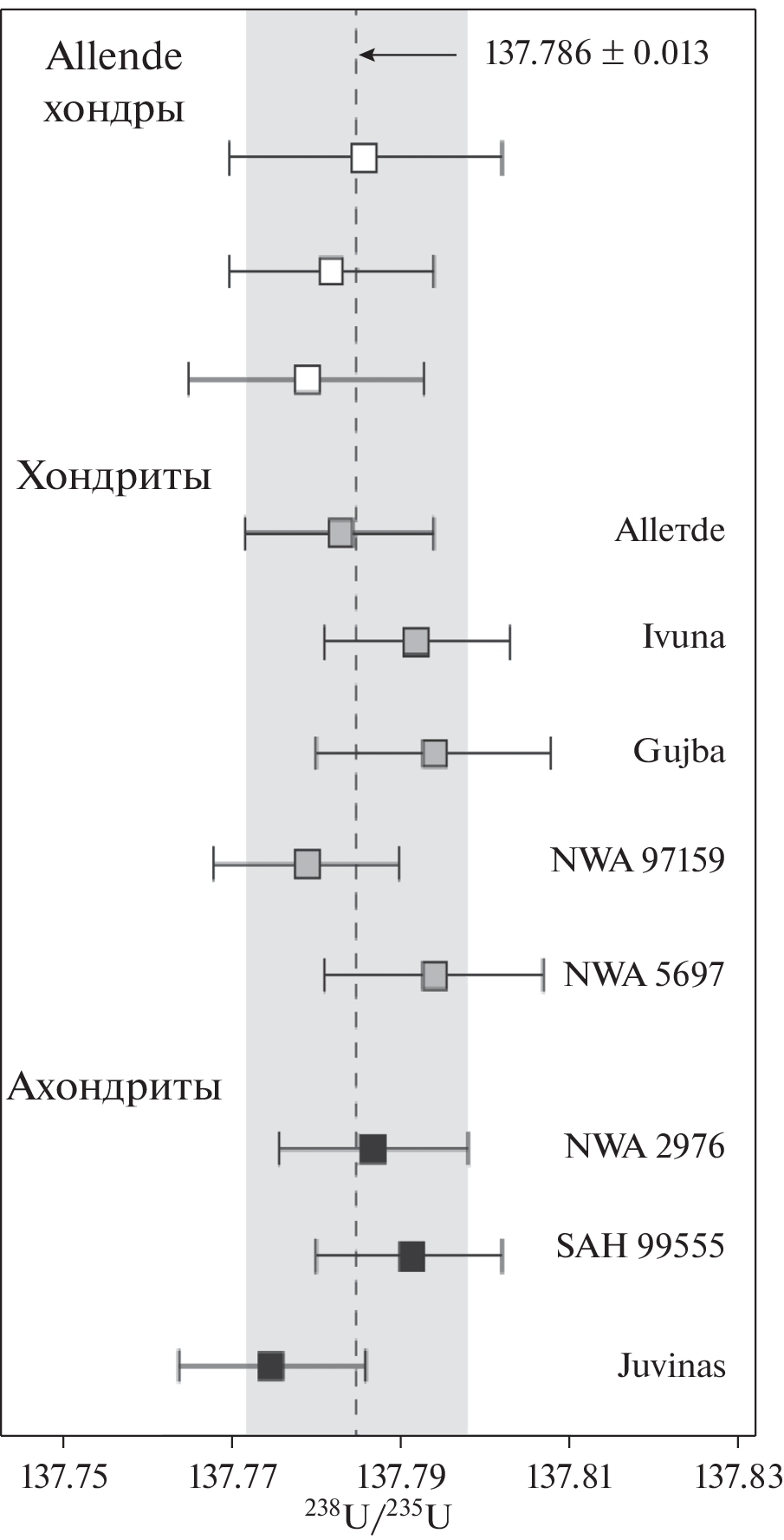 - Brennecka G.A., Wadhwa M. (2012) Uranium isotope compositions of the basaltic angrite meteorites and the chronological implications for the early Solar System. Proc. Nat. Acad. Sci. 109, 9299-9303.