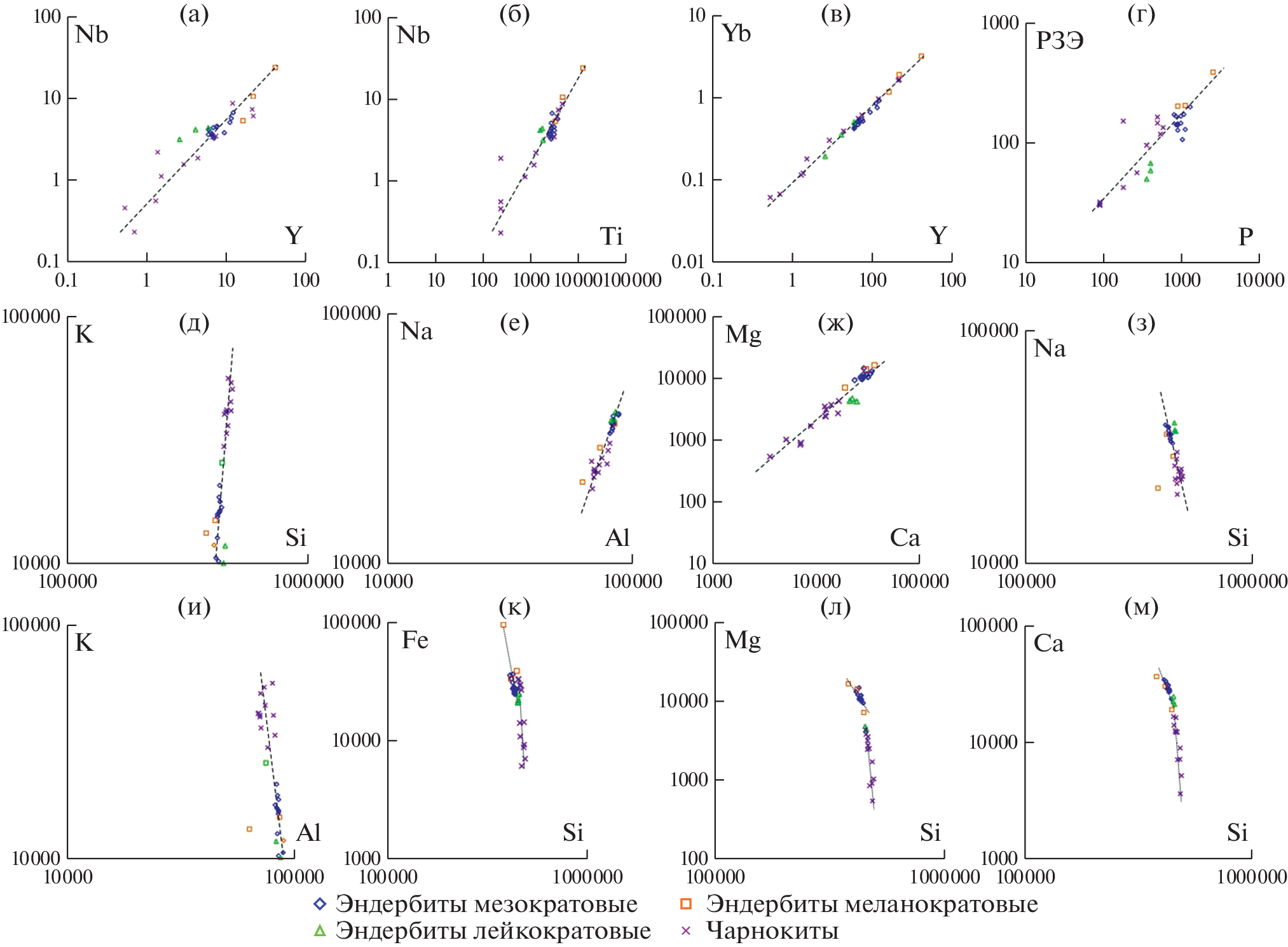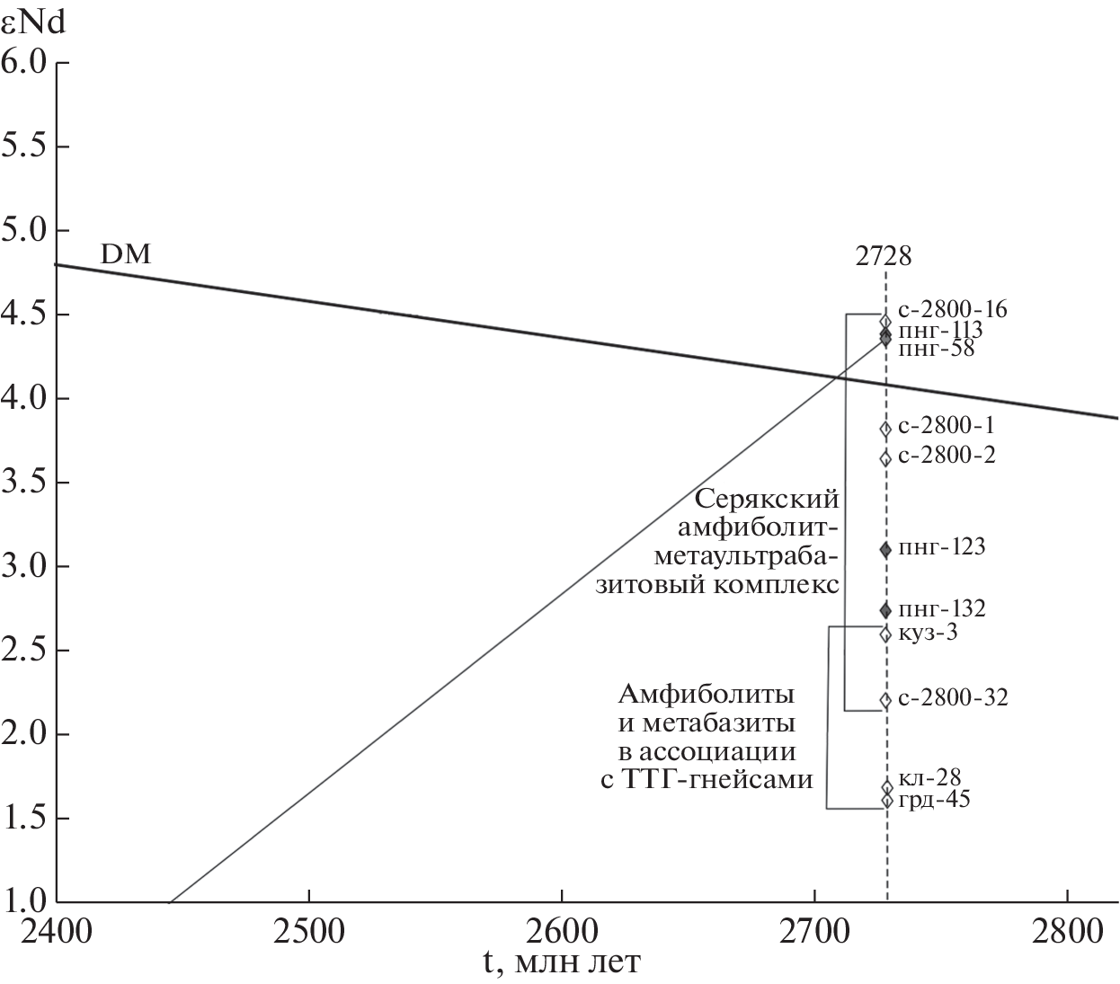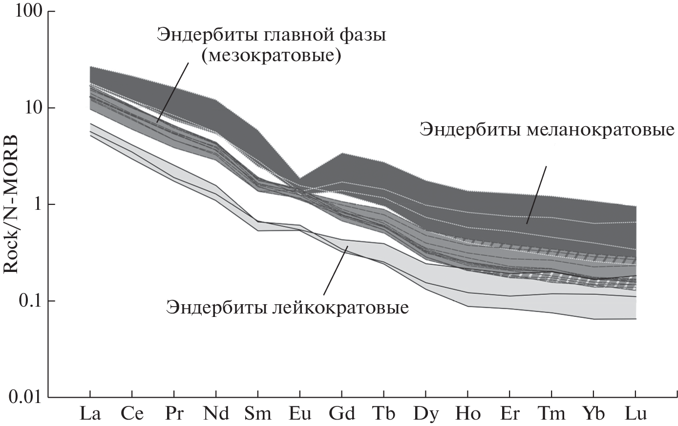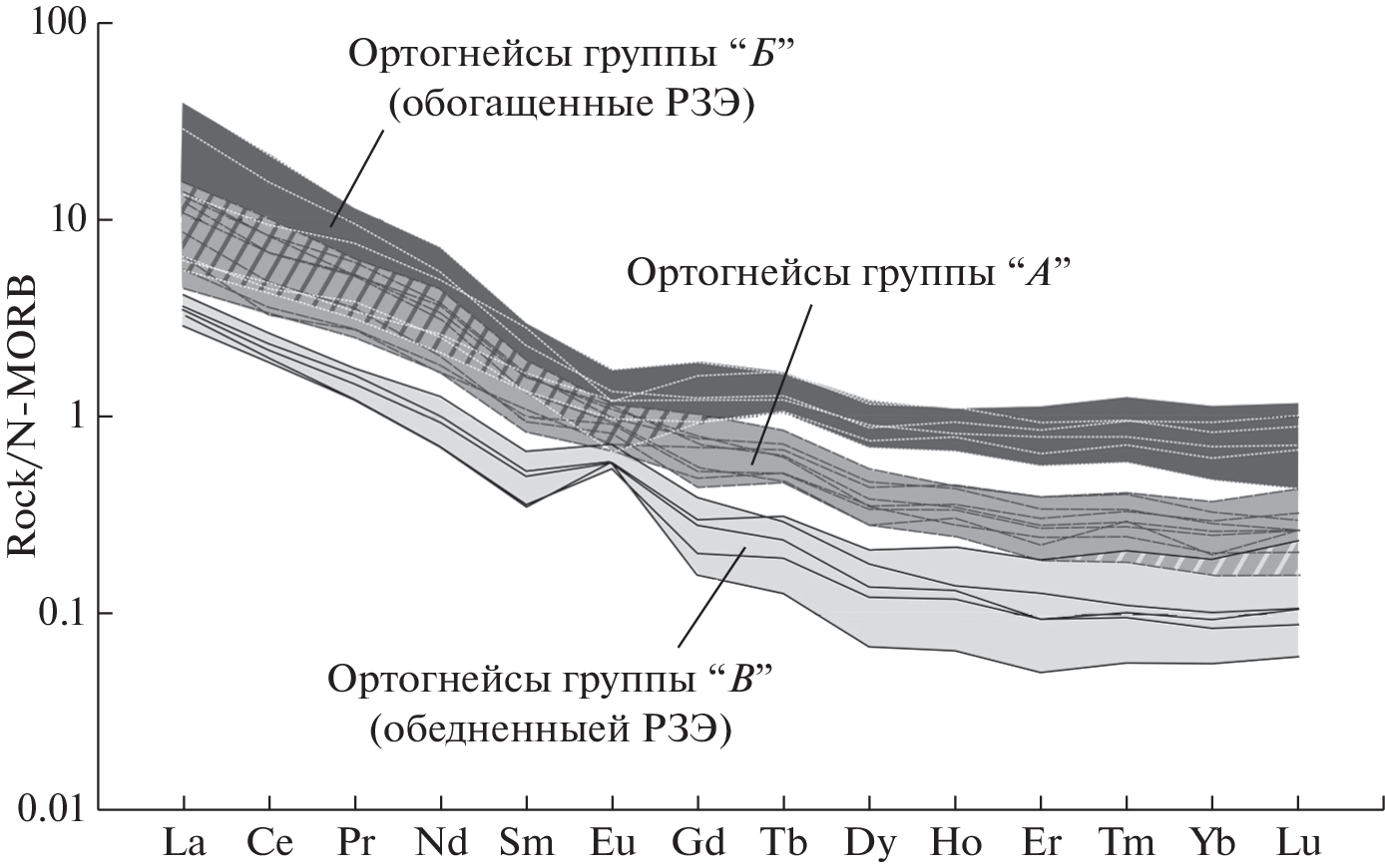 The paper presents authors’ original detailed data on rocks of the Archean Pon’goma-Navolok charnockite−enderbite complex in northern Karelia. The rocks practically have not been modified and are preserved within a rigid block among Paleoproterozoic zones of ductile deformations and metamorphism. The geochemistry of the rocks and their isotope−geochemical features indicate that the protolith from which the enderbite melts of the main phase of the massif were derived may have been amphibolites. The enderbite melts were derived from these amphibolites under the effect of K2O-, Na2O-, and SiO2-bearing fluids; and the enderbites were subsequently charnockitized with the involvement of fluids enriched in K2O and SiO2. Physicochemical modeling indicates that the enderbite melt was derived from the amphibolite protolith at a depth of about 45 km (P = 14.8 kbar, T = 1030−1080°C) under the effect of saline H2O−CO2 fluid. Comparison of the P−T parameters of the granulite-facies metamorphism of the metabasites and the parameters under which the enderbite melts were derived indicates that Archean granulite-facies metamorphism in the Belomorian belt in northern Karelia was of contact but not regional nature and was induced by the high-temperature field of an emplaced enderbite massif. The orthogneisses hosting the Pan’goma-Navolok massif inherit geochemical features of the unsheared, ungneissose, and unmetamorphosed enderbites. This means that enderbites analogous to those of the Pan’goma-Navolok massif may have served as the protolith of some of the orthogneisses, and that enderbites may have been spread more widely in the Archean than the currently preserved single enderbite massifs.