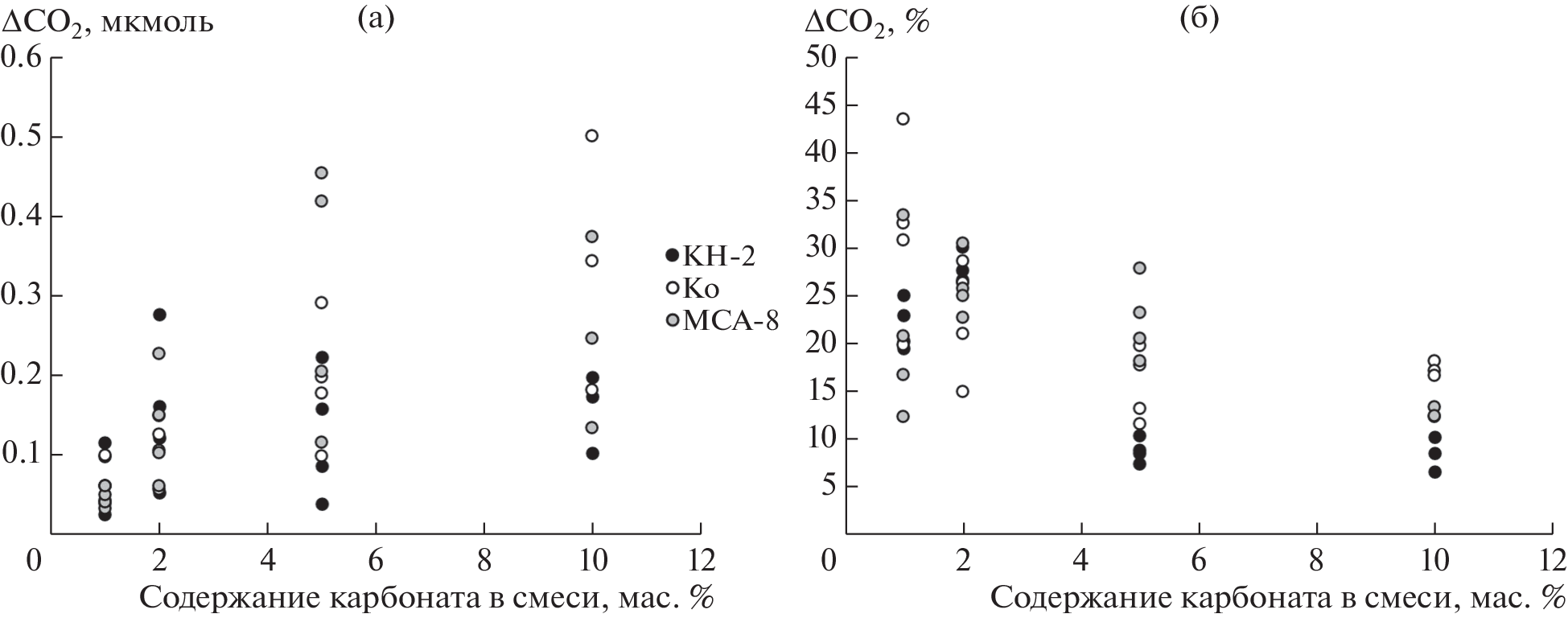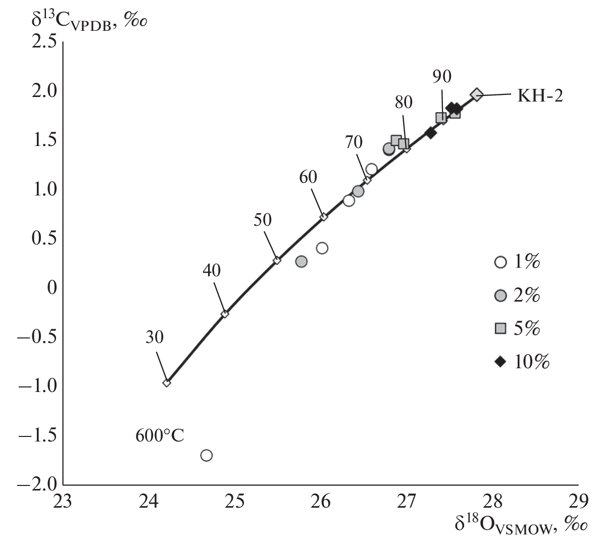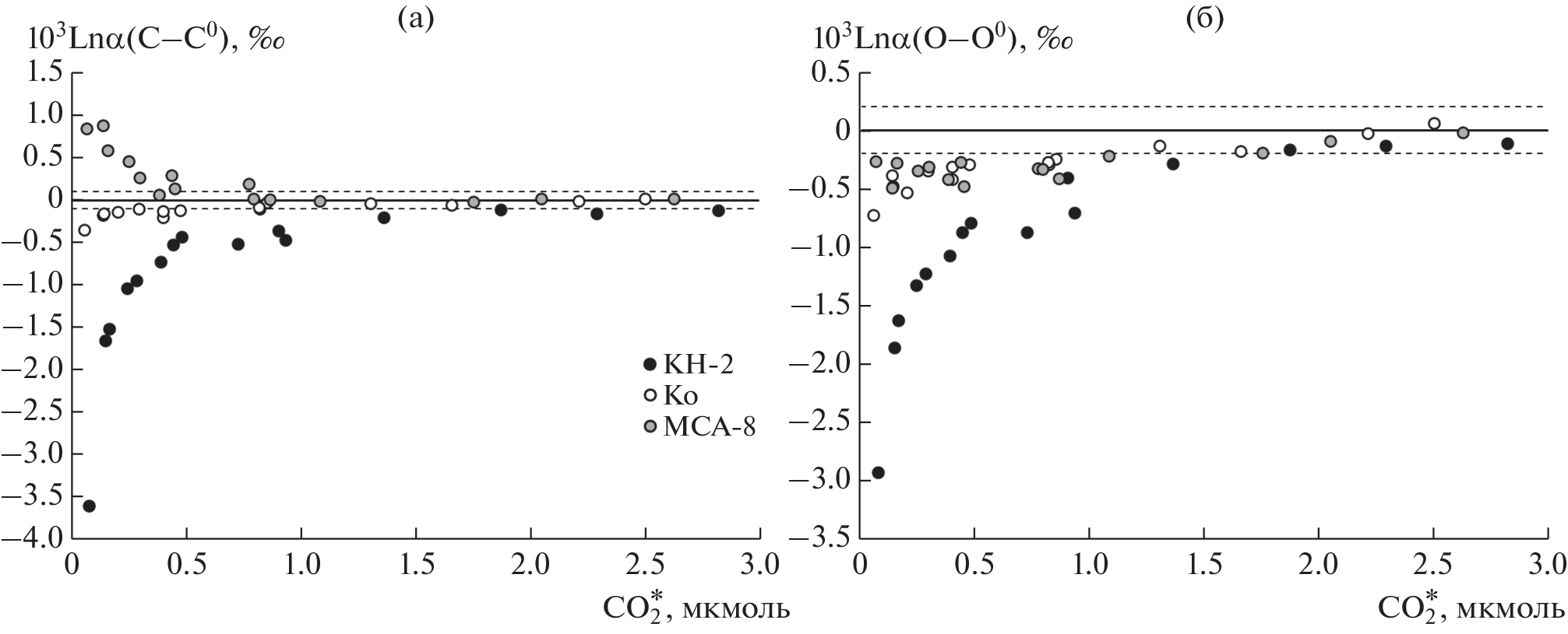 Проведено экспериментальное изучение основных факторов, влияющих на точность изотопного анализа кислорода и углерода карбонатов, диспергированных в силикатном матриксе. Искусственные 1, 2, 5 и 10%-ные смеси кварца с разными по изотопным параметрам карбонатами (КН-2, Ко, МСА-8) анализировались методом изотопной масс-спектрометрии в постоянном потоке гелия (CF IRMS). Установлено, что помимо влияния приборной нелинейности анализа малых количеств газа образца, на результаты влияют два фактора – следовые количества СО2, постоянно присутствующие в системе (эффект бланка) и присутствие химически нейтральных частиц силиката (эффект матрикса). Эффект бланка зависит от изотопных параметров образца и практически не влияет на оценку содержания карбоната в породе. Эффект матрикса, напротив, сильно сказывается на оценке содержания карбоната в породе, а изотопный сдвиг, им вызываемый, всегда направлен в сторону обеднения образца тяжелыми изотопами 13С и 18О. Показано, что данный эффект связан с процессами, протекающими в зоне интерфейса “СО2–кислота–поверхность кварца”, которые сопровождаются кинетическим фракционированием изотопов углерода и кислорода. Оба эффекта зависят от количества силикатного матрикса в системе и должны проявляться при анализе пород, бедных карбонатами. При содержании карбонатов в породе около 1–2%, отклонения от истинных значений δ13С и δ18О могут достигать первых промилле, а оценки содержаний карбоната в породе, проведенные методом калибровки хроматографического пика, могут быть занижены на 20–40%.