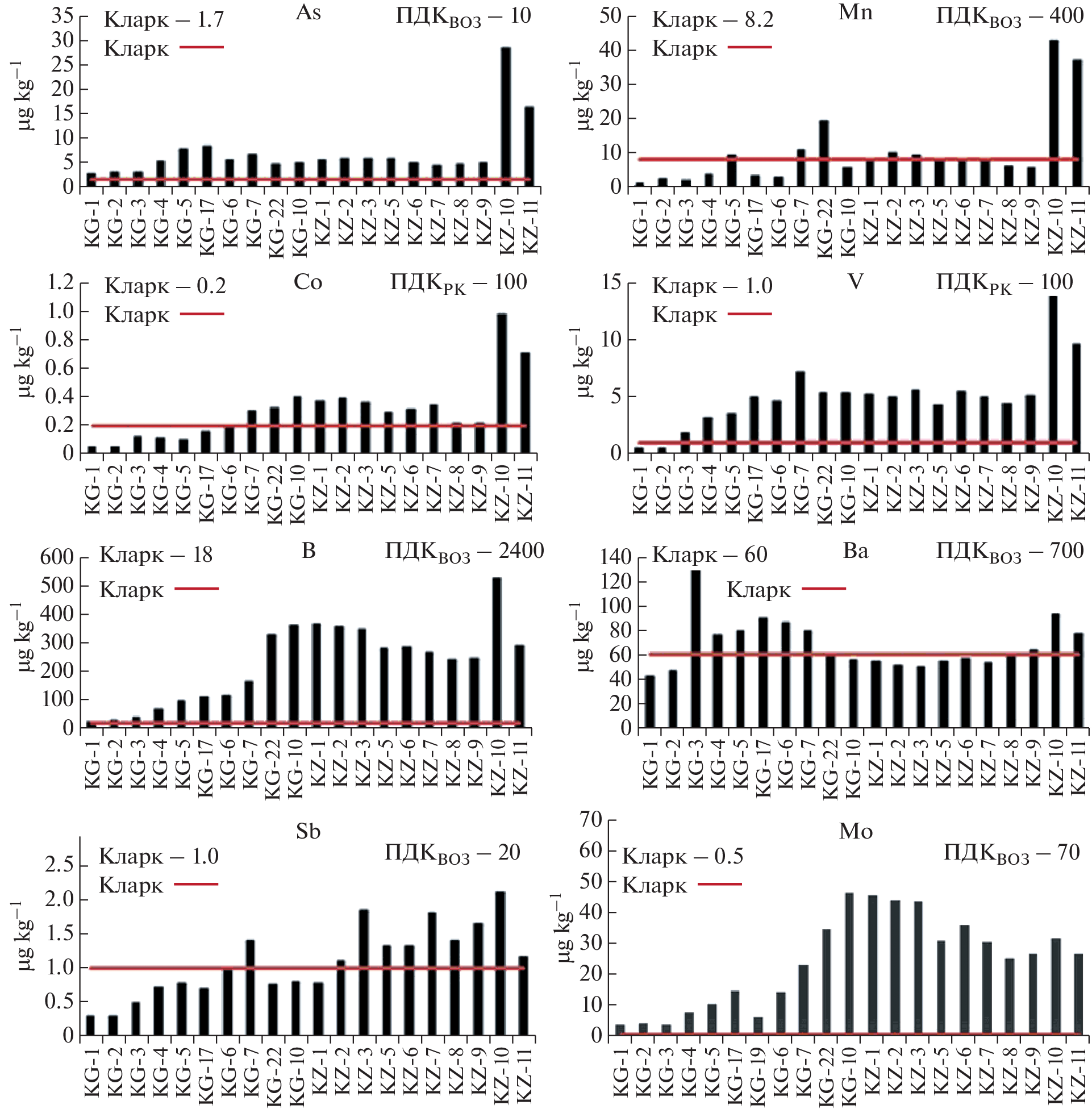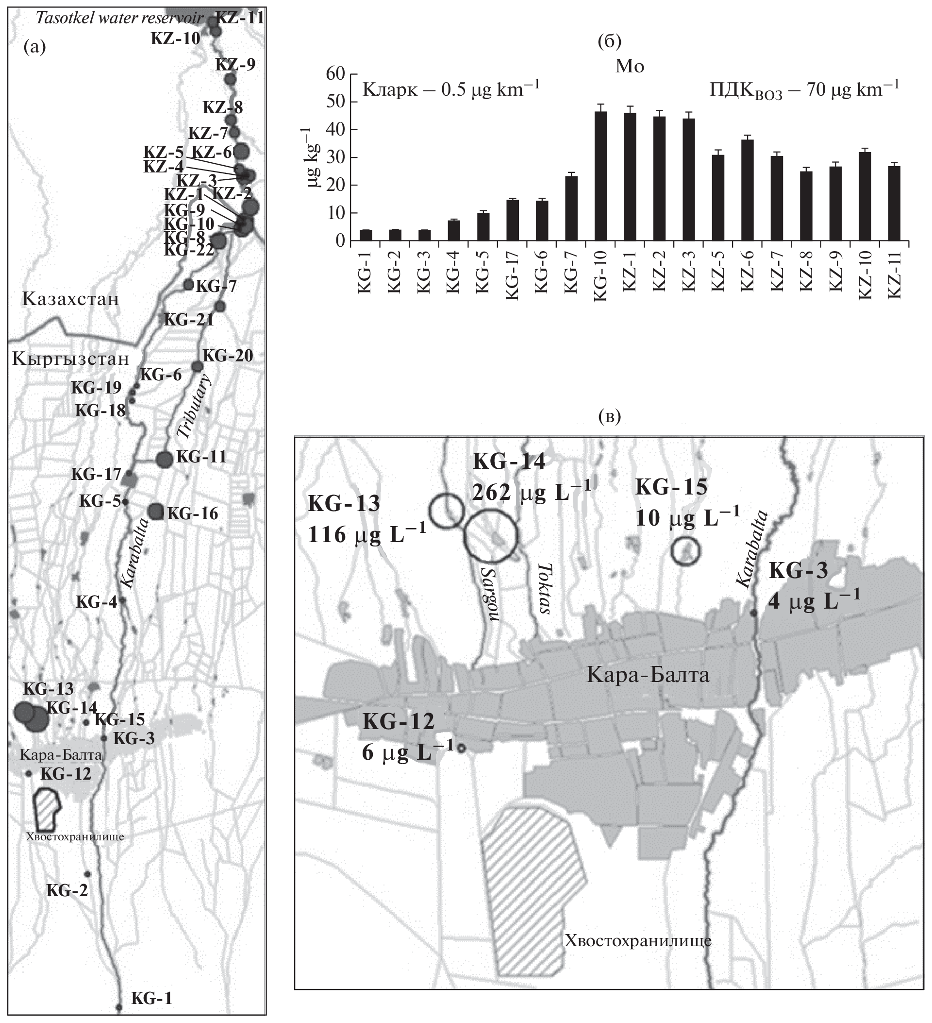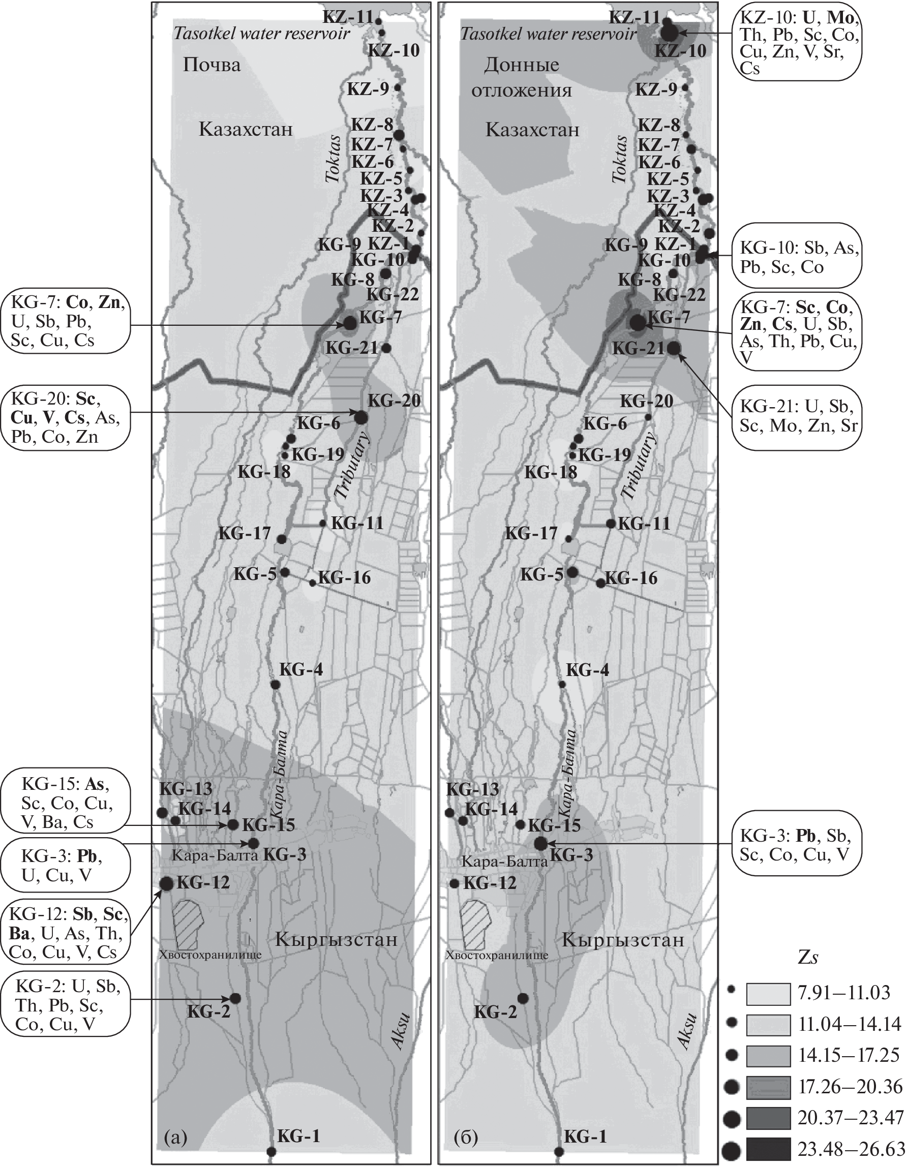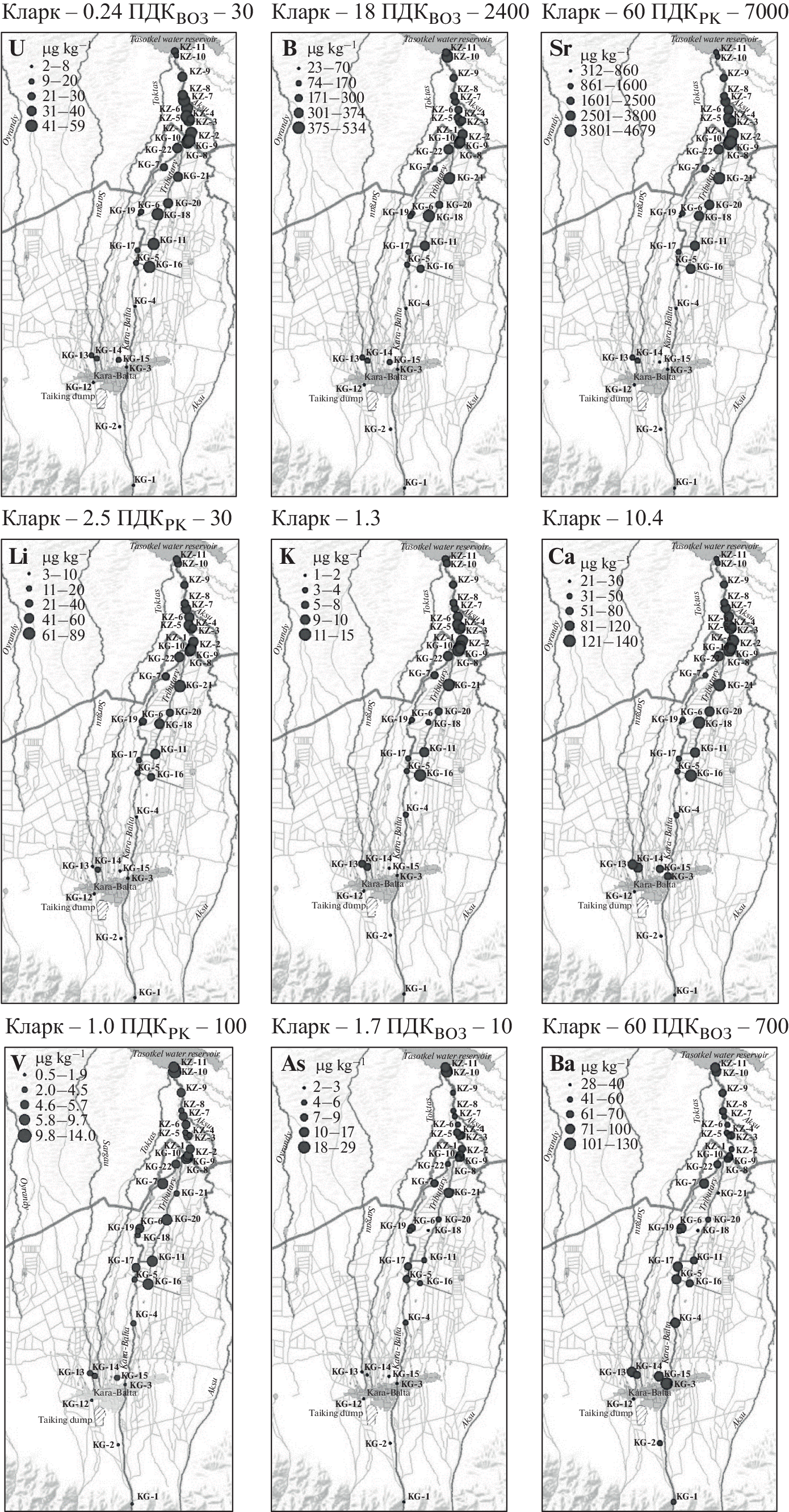 The paper presents the results of researches of the concentration of chemical elements and natural radionuclide in the environmental objects of the Kara-Balta transboundary river basin (adjacent territories of Kyrgyzstan and Kazakhstan). The level of contamination of floodplain soils and bottom sediments of the Kara-Balta River with such chemical elements as U, Sb, As, Th, Pb, Sc, Co, Cu, Mo, Zn, V, Sr, Ba, Cs was established. Based on the calculated indicators of the contamination factor (CF), enrichment factor (EF), and index of geoaccumulation (Igeo), it was found that Sb, As and Br make the largest contribution to soil and bottom sediment pollution in the Kara-Balta water basin. At three checkpoints, an increased concentrations of U, B, Li, Sr, Mo were found in the water samples of the region’s reservoirs, which is related to the influence of the tailings of the Kara-Balta mining plant. The elevated concentrations of As, B, Ba, Co, Mn, Sb, V, and Zn were also established around the mouth of the Kara-Balta River, which flows into the Tasotkel reservoir (Kazakhstan). The results of the research can be explained by the fact that a significant part of the Kara-Balta transboundary river basin is located in the zone of a uranium natural–technogenic province.
