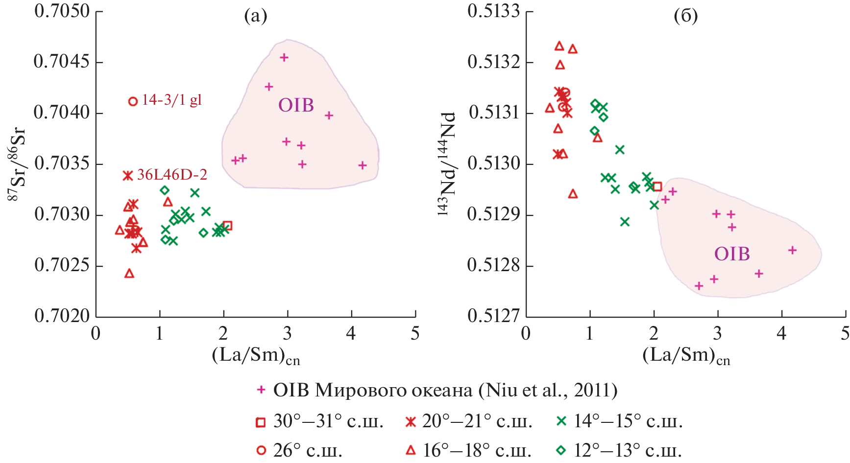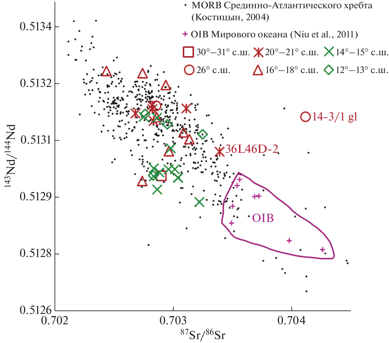 - Силантьев С.А., Данюшевский Л.В., Плечова А.А., Доссо Л., Базылев Б.А., Бельтенев В.Е. (2008) Геохимические и изотопные черты продуктов магматизма рифтовой долины САХ в районах 12°49′–17°23 с.ш. и 29°59′–33°41 с.ш.: свидетельство двух контрастных источников родительских расплавов. Петрология. 16(1), 38-65.