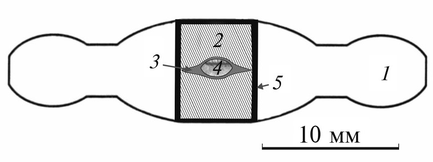 Рис. 1. Схема экспериментальной ячейки аппарата “наковальня с лункой – тороид”: 1 – ячейка из литографского камня – известняка Алгети, Грузия; 2 – термостойкая втулка-держатель (смесь порошков MgO и гексагонального BN) для ампулы с исследуемым веществом; 3 – платиновая ампула; 4 – экспериментальное вещество; 5 – графитовая втулка-нагреватель.