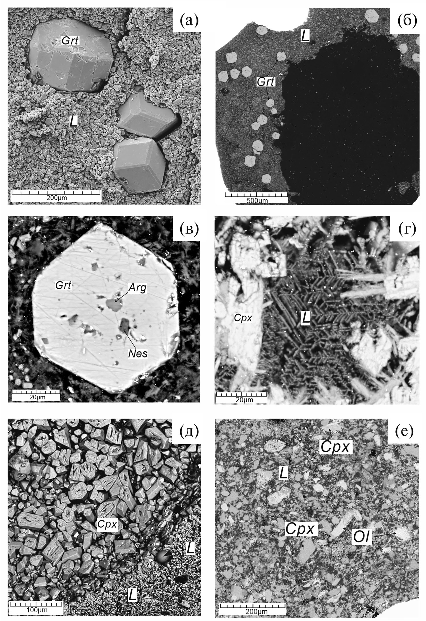 Рис. 3. СЭМ-фотографии экспериментальных образцов: а, г – обр. 3326; б, в – обр. 3309; д – обр. 3325; е – обр. 3292. а–в – реакционный гранат в карбонатно-силикатном раскристаллизованном расплаве, г, д – зерна клинопироксенов в локальном равновесии с карбонатно-силикатным расплавом, е – перидотитовая ассоциация Ol+Cpx+L.