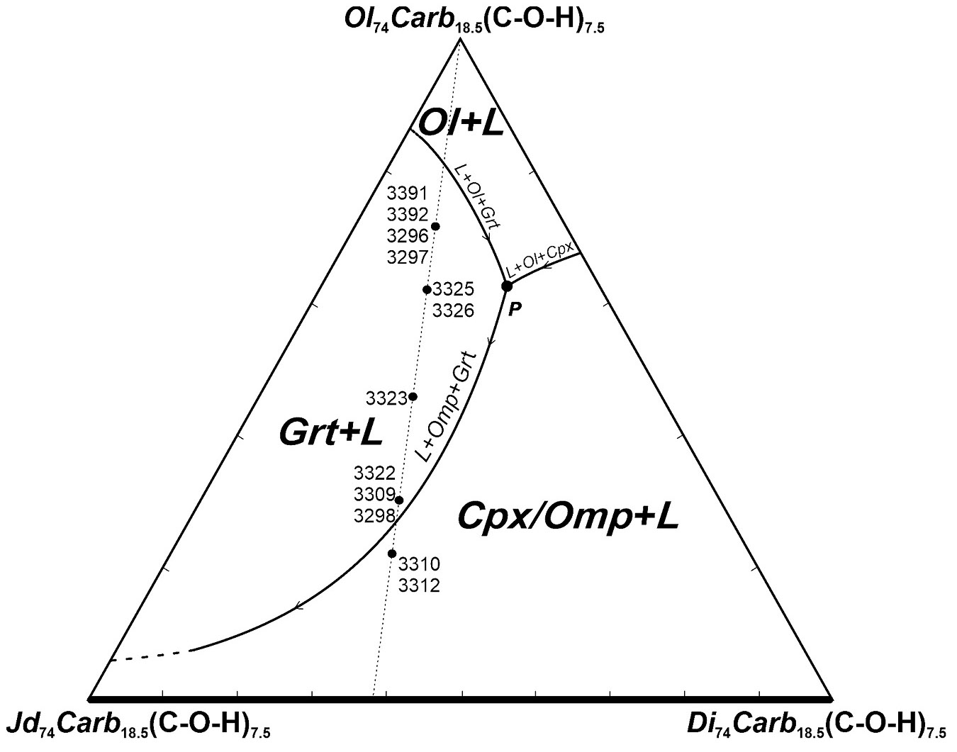 3309 | [(Ol30 Jd43.40Di26.6)80Carb20]92.5COH7.5 | 950 | 90 | Grt | 37.11 | 16.50 | 19.11 | 3.83 | 21.39 | 0.43 | – | 98.37 |
