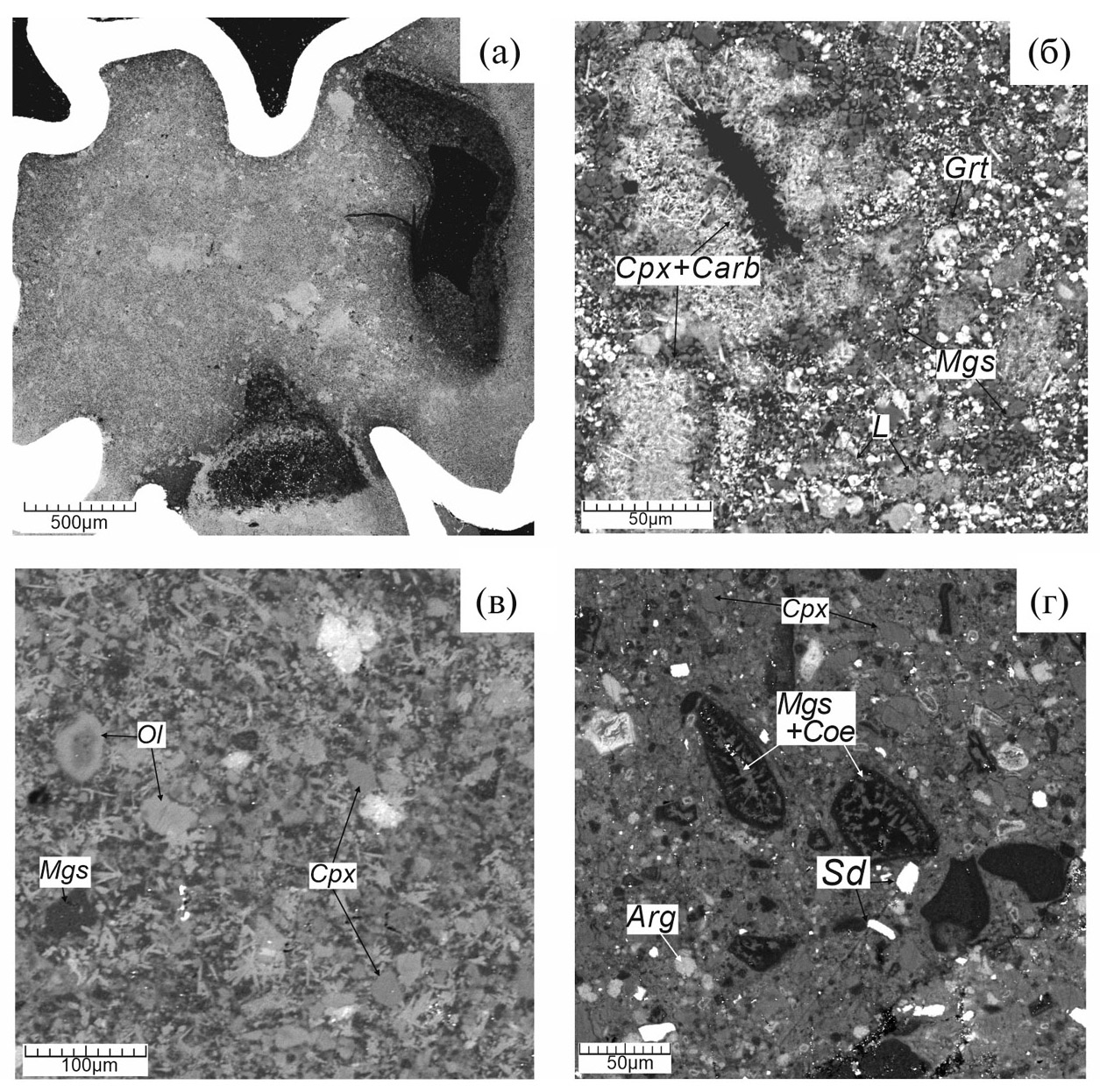 О карбонатизации силикатных компонентов ультрабазитовых расплавов при воздействии растворяющихся в них летучих СО2-компонентов сверхкритического флюида С–О–Н свидетельствуют многочисленные мелкие зерна закалочных карбонатов натрия (Na2CO3), а также карбонатов Mg, Fe и Са, которые обнаруживаются в смесях с закалочными клинопироксенами/омфацитами. В результате частичной карбонатизации силикатов образуются магнезит (Mgs), арагонит (Arg), а также (Mg-Fe)-, (Mg-Ca-Fe)- и (Na-Сa)-карбонаты, которые также встречаются как включения в гранатах (рис. 3в). Мелкие карбонатные фазы распространены как составляющие основной массы экспериментальных образцов.