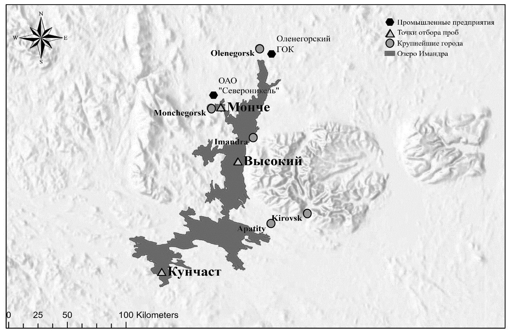 Рис. 1. Озеро Имандра. Крупные города и промышленные предприятия на водосборе.