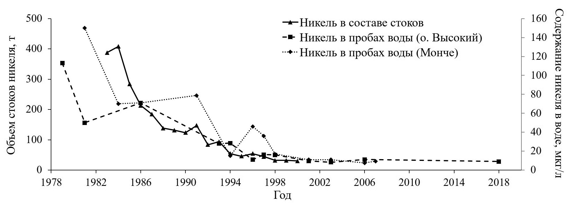 На рис. 2 представлены данные по поступлению никеля в составе сточных вод и его содержания в водах озера непосредственно вблизи источника (залив Монче), а также в центральной части Имандры – у острова Высокий (на удалении около 60 км). На основе этих данных были выделены условно два периода времени – индустриальный с 1970-х гг. до начала 2000-х (хотя сброс сточных вод велся и значительно раньше) и современный период 2012–2018 гг. Средние значения параметров для поверхностного и придонного слоев представлены в таблице 1.
