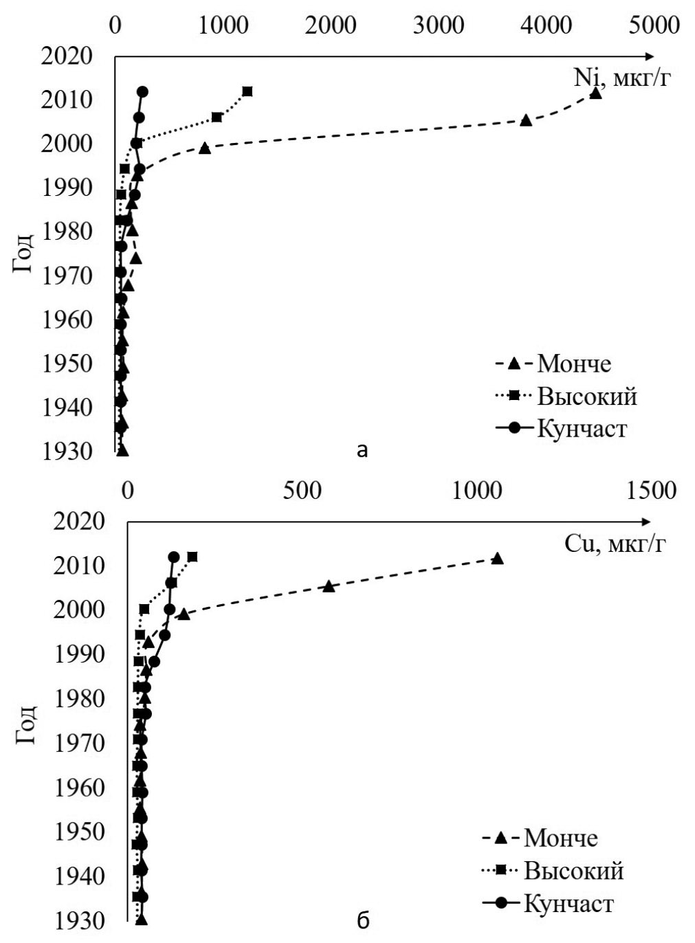 Рис. 3. Содержание никеля (а), меди (б) в колонках донных отложений, отобранных на оз. Имандра.