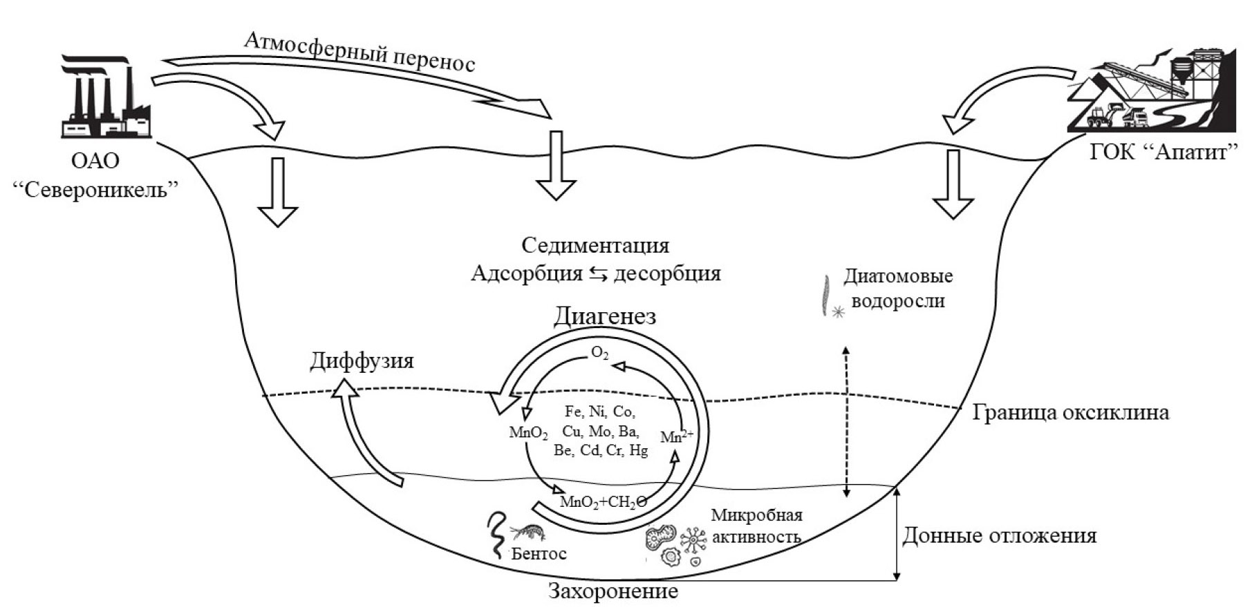 В работе (Matisoff, Carson, 2014) на примере озера Эри показано, что осаждение марганца в бескислородных условиях, по-видимому, регулируется другим процессом, а именно: соосаждением карбоната и фосфата. При смещении границы оксиклина в ДО происходит осаждение из иловой воды тех комбинаций ионов, каковые пересыщают ее. Обмен веществ захватывает осадок на глубину 1–6 мм. Данный процесс также хорошо представлен в работе на примере озера Виннипег (Matisoff et al., 2017) как ранний диагенез. Во многом седиментация металлов в донные отложения контролируется многокомпонентной диффузией, а также сложным взаимодействием в окислительно-восстановительной среде (с участием микробного сообщества), которая определяет диффузионный перенос тяжелых металлов на поверхность ДО озера.