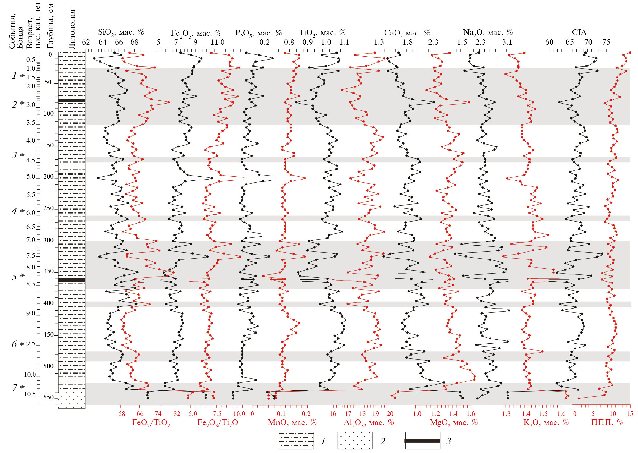 Рис. 7. Литология разреза и распределение геохимических характеристик по разрезу скважины ЧС-2: 1 – песок; 2 – алеврит; 3 – тефра.