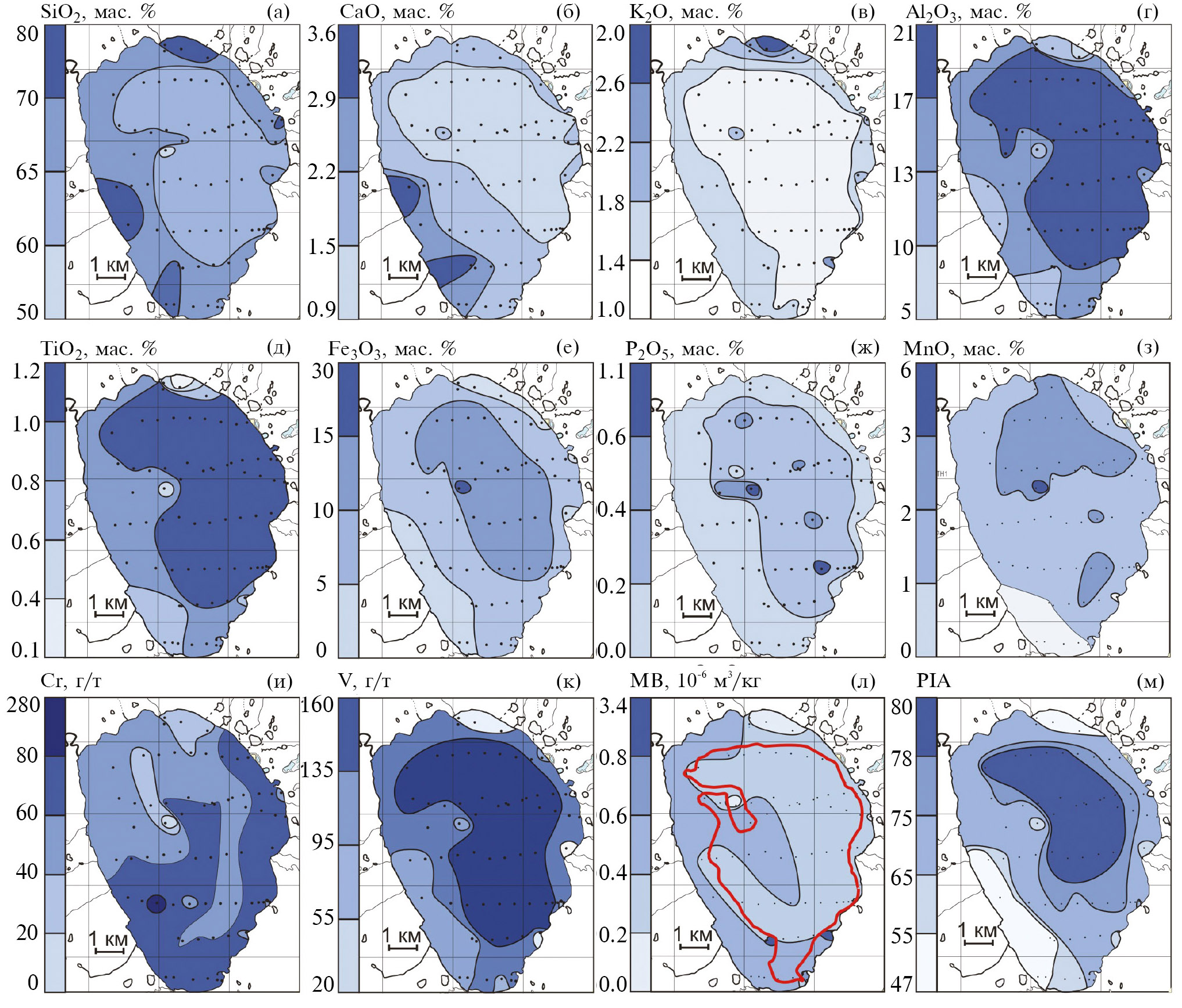 В зоне распространения песков по периметру оз. Чистое отмечены повышенные концентрации мобильных оксидов SiO2, CaO, Na2O, K2O и высокие значения магнитной восприимчивости (рис. 8 а, б, в, л). В центральных частях озера доминируют тонкие литологические разности. Они обогащены Al2O3, TiO2, Fe2O3, MgO, V, P2O5, имеют высокие значения ППП, CIA, PIA (рис. 8 г–ж, к, м). Распределение хрома по латерали сложное, но в целом повышенные значения характерны для осадков южной и восточной частей озера. Марганцем обогащены осадки в северной части озера.