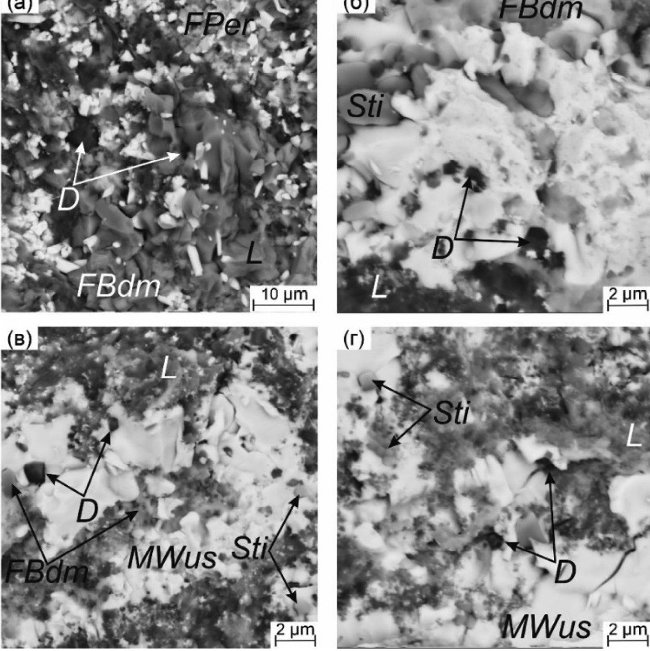 Рис. 3. СЭМ снимки экспериментальных образцов, полученных при кристаллизации алмазов и ассоциированных минеральных фаз в расплавах, пересыщенных растворенным углеродом, в политермическом сечении (MgO)30(FeO)20Carb*50 – (SiO2)30(FeO)20Carb*50: (см. рис. 9 с алмазообразующими составами 1, 2 и 3 при 26 ГПа и 1700 °С). Алмазоносные образцы после закалки: (а, состав 1) – L + алмаз D + FPer + FBrd; (б и в, состав 2) – L + D+ FBdm + Sti и L + FBdm + MWus + Sti; (г, состав 3) – L + D + MWus + Sti. По данным (Spivak, Litvin, 2019).