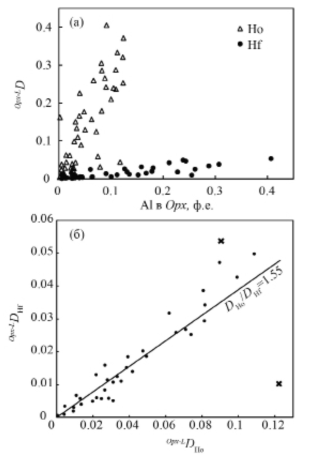 Эти закономерности иллюстрируются на примере распределения Hf и Ho между ортопироксеном и расплавом. На рис. 1а хорошо видно, что OpxLDHo и OpxLDHf варьируют более чем на порядок, причем существует отчетливая зависимость обоих коэффициентов от содержания Al в ортопироксене. Рисунок 1б показывает прямую корреляцию OpxLDHf и OpxLDHo, причем отношение DHf/DHo не зависит от экспериментальных параметров.