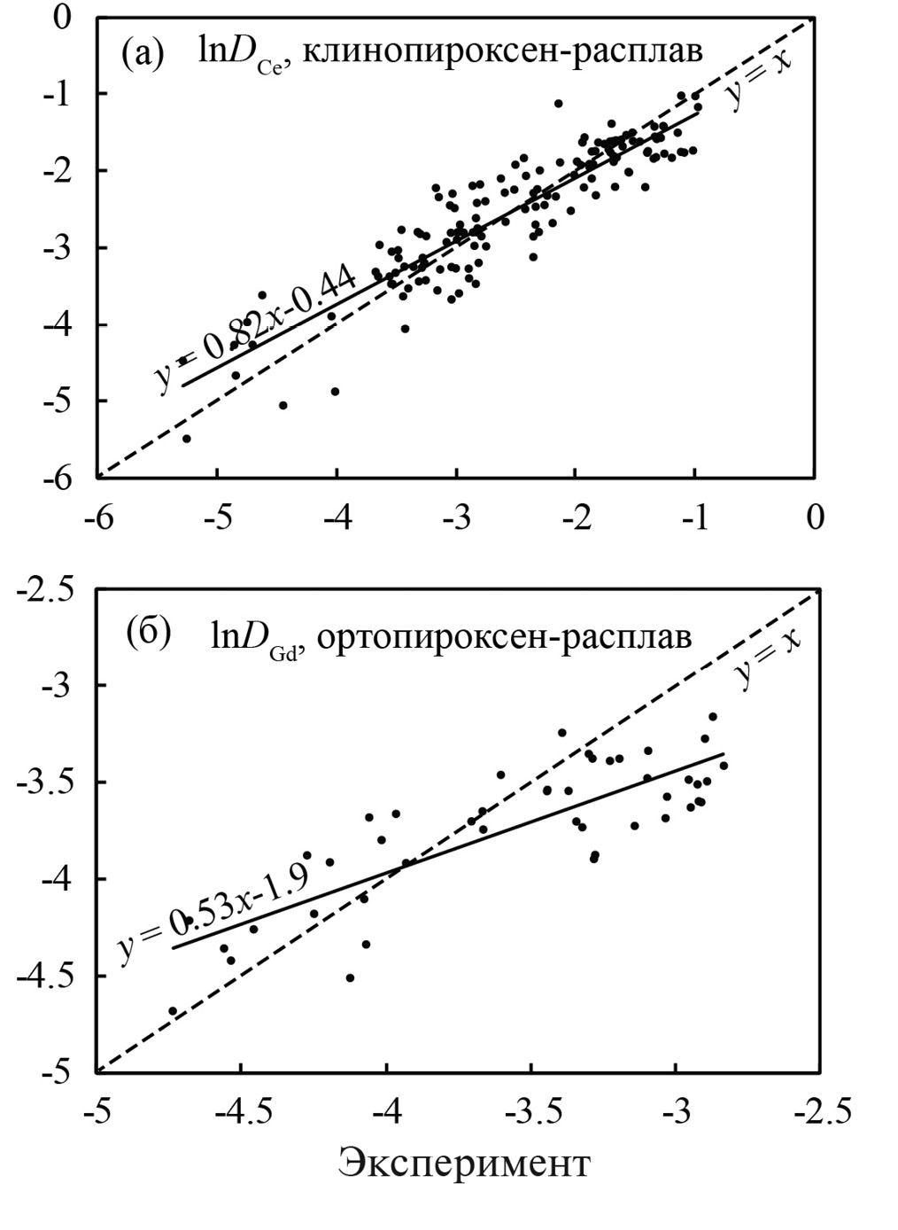 5. Fig. 4. Correlation of experimental and model values ​​of lnDi using the example of (a) Cpx-LDCe and (b) Opx-LDGd. The deviation of the dependencies from the ideal slope of 1:1 is due to the fact that the models minimize the deviations of not only lnDi, but also ln(Di/Dj). As a result, the deviation for an individual element can be greater than when calculating the dependence for each element separately, but this achieves better consistency of the results for different elements.