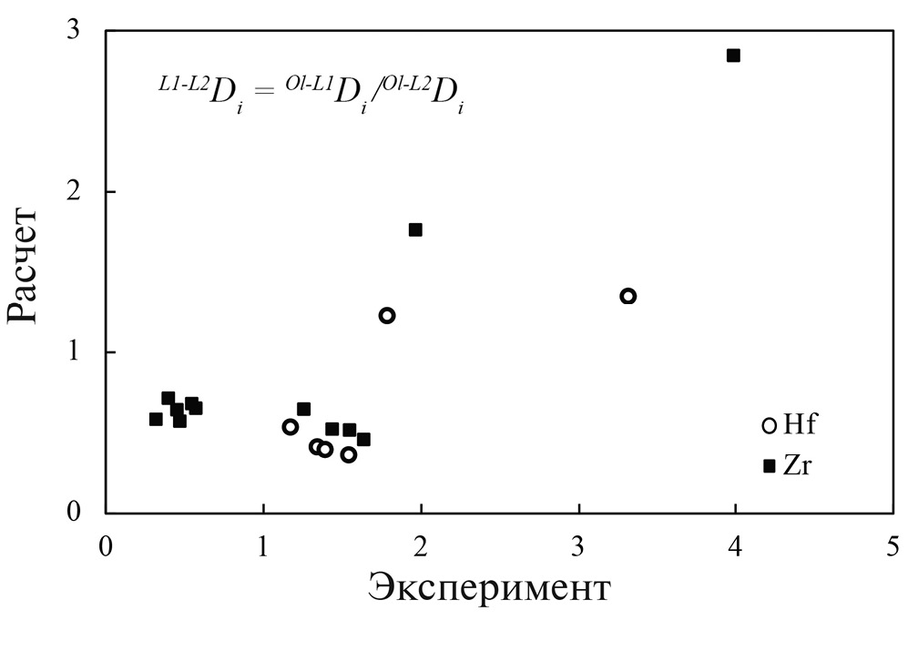 В качестве одного из возможных критериев правильности модельных зависимостей значений Di от состава расплава логично использовать упоминавшиеся выше экспериментальные данные по распределению элементов между двумя несмешивающимися силикатными расплавами, поскольку оба расплава равновесны с кристаллическими фазами одинакового состава. Результаты таких экспериментов предоставляют уникальную возможность наблюдать “в чистом виде” влияние состава расплава на коэффициенты распределения. Попытка провести сравнение экспериментальных и расчетных данных дала скорее отрицательный результат. К сожалению, данные по распределению редких элементов между двумя силикатными расплавами пока очень ограничены, и составы расплавов далеки от области, в которой получены данные для равновесия расплавов с оливином и пироксенами. Тем не менее, для отдельных элементов наблюдается прямая корреляция между экспериментальными и расчетными значениями. Пример такой корреляции для распределения Hf и Zr показан на рис. 5. Но и в этом случае для некоторых точек не соблюдается соответствие направления фракционирования элементов – экспериментальные значения могут быть >1, а расчетные <1. Отметим, что эти точки получены для кислых расплавов с высокими содержаниями F (Yang, van Hinsberg, 2019), что может вносить свой вклад в наблюдаемое противоречие. Но надо признать, что для большинства других элементов надежных данных еще меньше, а соответствие экспериментальных и расчетных величин часто даже хуже. Поэтому, можно считать, что сам по себе рассмотренный критерий интересный и заслуживает внимания, но имеющиеся в настоящее время данные не достаточны для его широкого применения. Оптимальным было бы использование составов двух расплавов в равновесии с соответствующим минералом, но такие эксперименты на сегодняшний день попросту отсутствуют.