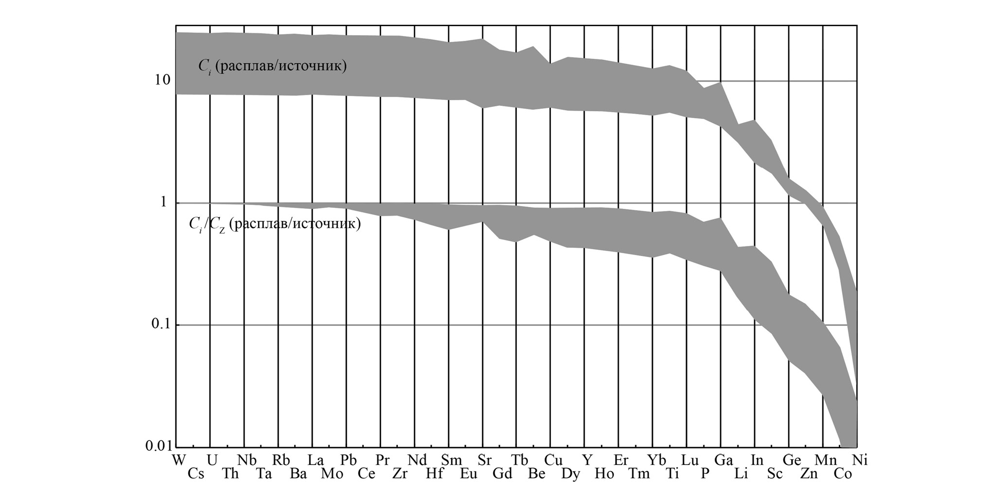 Содержания редких элементов в источнике изначально считались неизвестными, расчеты проведены для условных безразмерных концентраций Ci = 1, что эквивалентно нормализации составов расплавов к содержаниям в мантийном источнике.