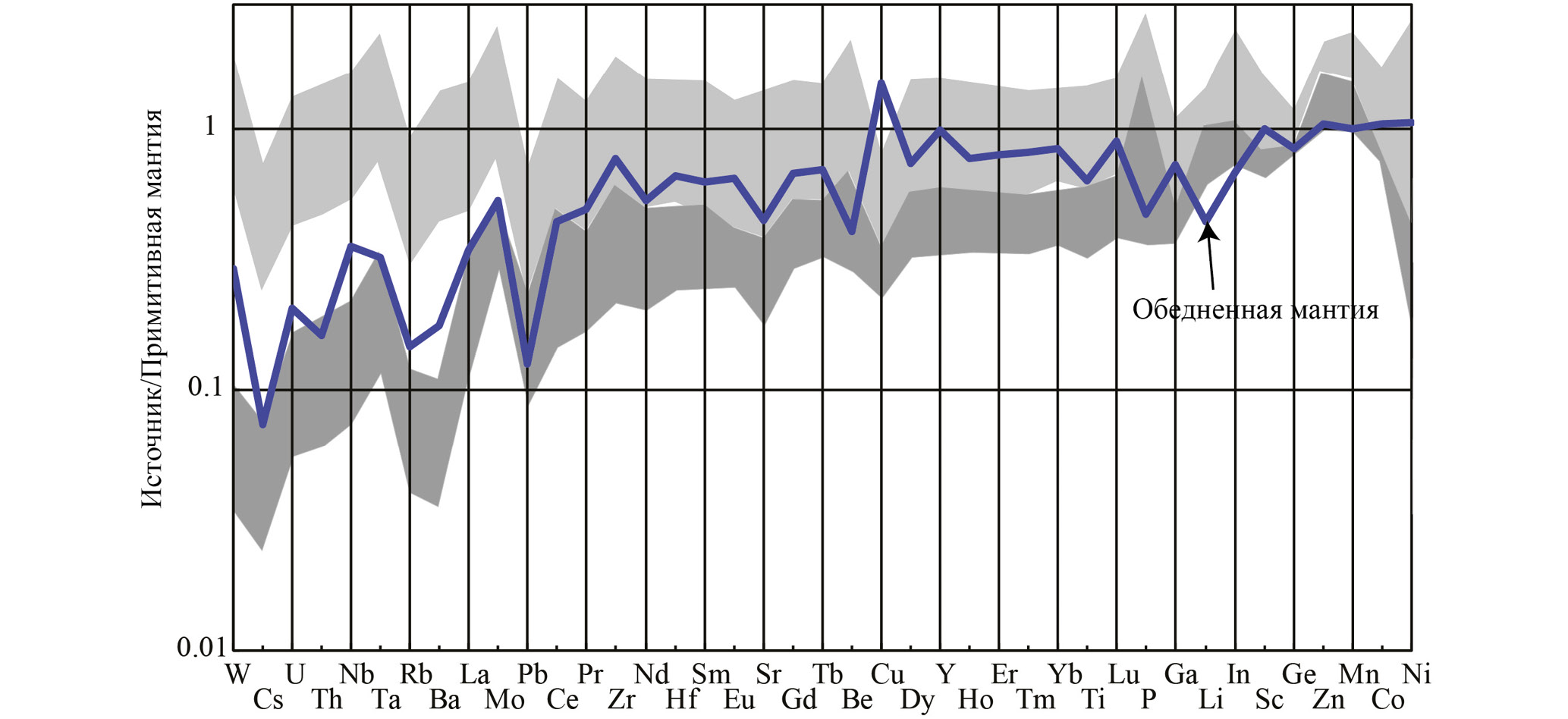 8. Fig. 7. Source compositions of mid-ocean ridge basalts calculated for the variations in normalized compositions shown in Fig. 5. The upper and lower gray fields correspond to the most and least enriched compositions of melt inclusions and rock glasses (Naumov et al., 2022), respectively. The thick line in the central part is the composition of the depleted mantle according to (Salters, Stracke, 2004). All compositions are normalized to the contents in the primitive mantle (Palme, O’Neill, 2014).
