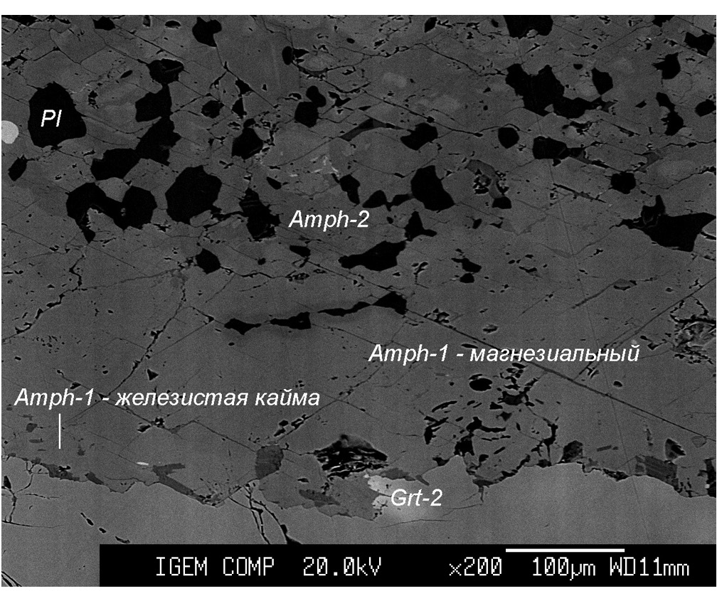 (1) Реликтовая ассоциация, вероятно, была представлена гранатом-1, омфацитом и кварцем, то есть представляла собой эклогиты. Но сохранилась она весьма плохо. От омфацита остались только характерные структуры распада, представленные плагиоклаз-клинопироксеновым симплектитом. При этом клинопироксен в структурах распада практически полностью замещен амфиболом-1 – паргаситом (рис. 2). Первичный кислый плагиоклаз, характерный для структур распада, также не сохранился. Отдельные зерна, встреченные в этих структурах, представлены битовнитом с An = 82 мол. % (табл. 1, анализ 36). Гранат-1, относящийся к эклогитовой ассоциации, сохранился в центральных частях зерен. Он слагает ядра неправильной формы, выделяющиеся по темно-серому фототону и обособленные относительно светло-серой новообразованной каймы граната-2 (рис. 3).